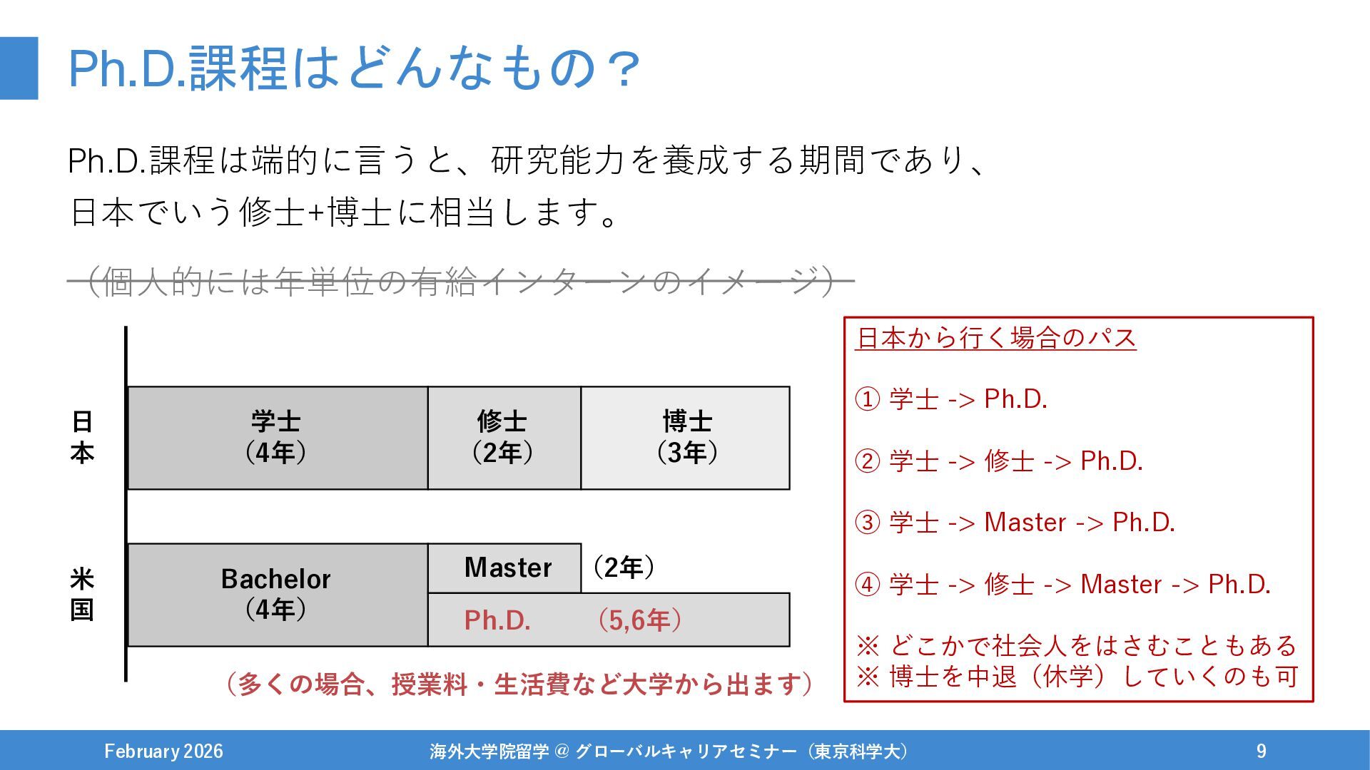 Ph.D.課程はどんなもの? Ph.D.課程は端的に言うと、研究能力を養成する期間であり、 日本でいう修士+博士に相当します。 February 2026 海外大学院留学 @ グローバルキャリアセミナー(東京科学大) 8 学士