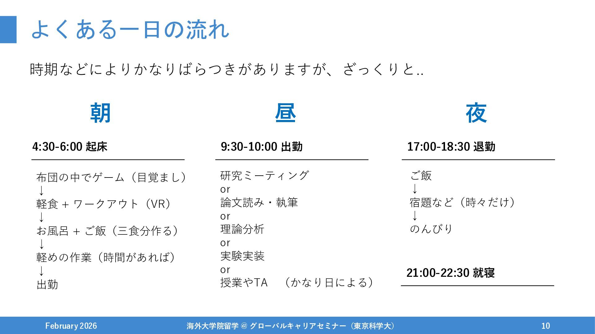 よくある一日の流れ 時期などによりかなりばらつきがありますが、ざっくりと.. February 2026 海外大学院留学 @ グローバルキャリアセミナー(東京科学大) 10 朝 昼