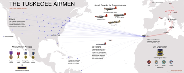 Nona II, P-40 332nd Fighter Group 99th 100th 301st 302nd THE TUSKEGEE AIRMEN “Red-Tailed Angels Spit Fire” Ramitelli Morocco Moton Field Tunisia Sicily Berlin Tapolca Toulon Origins The Tuskegee Airmen orginated from all over the United States (40 of 48 states and D.C.). They trained at Moton Field in Alabama Three airmen orginiated in the Caribbean (Haiti, Virgin Is. and Trinidad) Initially based in Morocco, the groups moved to Sicily and on to Ramitelli, Italy. Originating States Sites of Aeiral Victories Aircraft Flown by the Tuskegee Airmen Unit Organization Squadrons Military Honors Awarded 8 14 96 744 3 Distinguished Unit Citations Operations The group operated in Italy, France, Germany, Austria, Hungary and Czechoslovakia and scored 112 aerial victories and performed 79 bomber escort missions with a low 3.9% mission loss rate. Anthony Starks, @ajstarks Aircraft Illustrations by Gaëtan Marie Purple Hearts Bronze Stars Distinguished Flying Crosses Air Medals