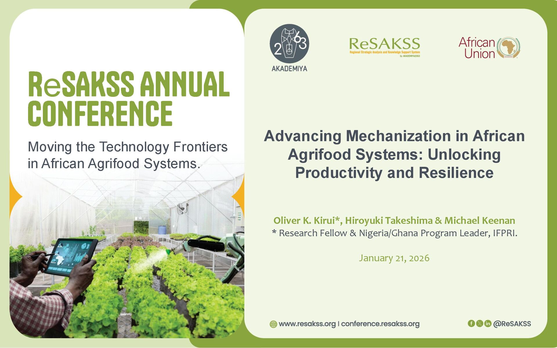 Advancing Mechanization in African Agrifood Systems: Unlocking Productivity and Resilience Oliver K. Kirui*, Hiroyuki Takeshima & Michael Keenan * Research Fellow & Nigeria/Ghana Program Leader, IFPRI. January 21, 2026