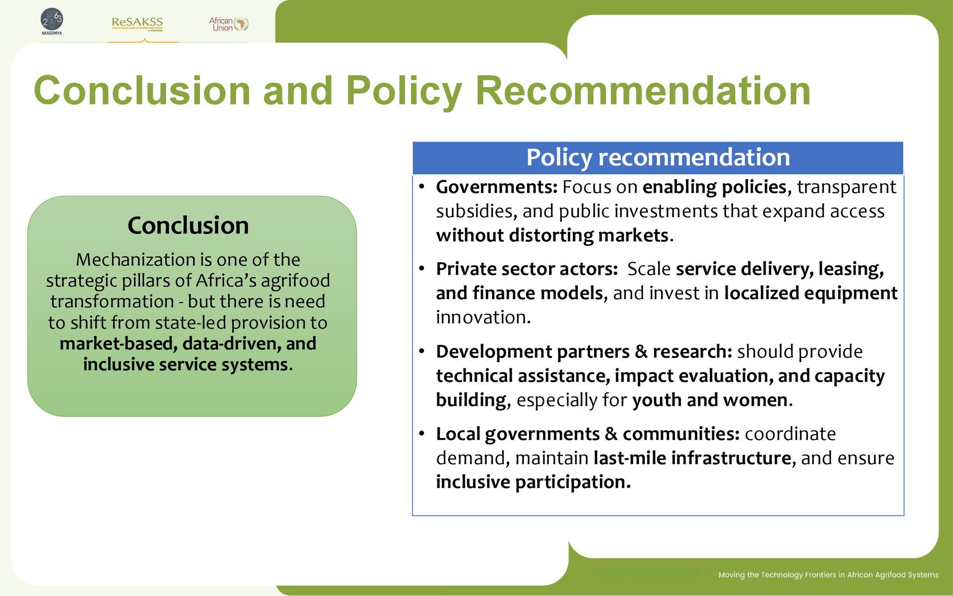 transparent subsidies, and public investments that expand access without distorting markets. • Private sector actors: Scale service delivery, leasing, and finance models, and invest in localized equipment innovation. • Development partners & research: should provide technical assistance, impact evaluation, and capacity building, especially for youth and women. • Local governments & communities: coordinate demand, maintain last-mile infrastructure, and ensure inclusive participation. Conclusion Mechanization is one of the strategic pillars of Africa’s agrifood transformation - but there is need to shift from state-led provision to market-based, data-driven, and inclusive service systems. Policy recommendation