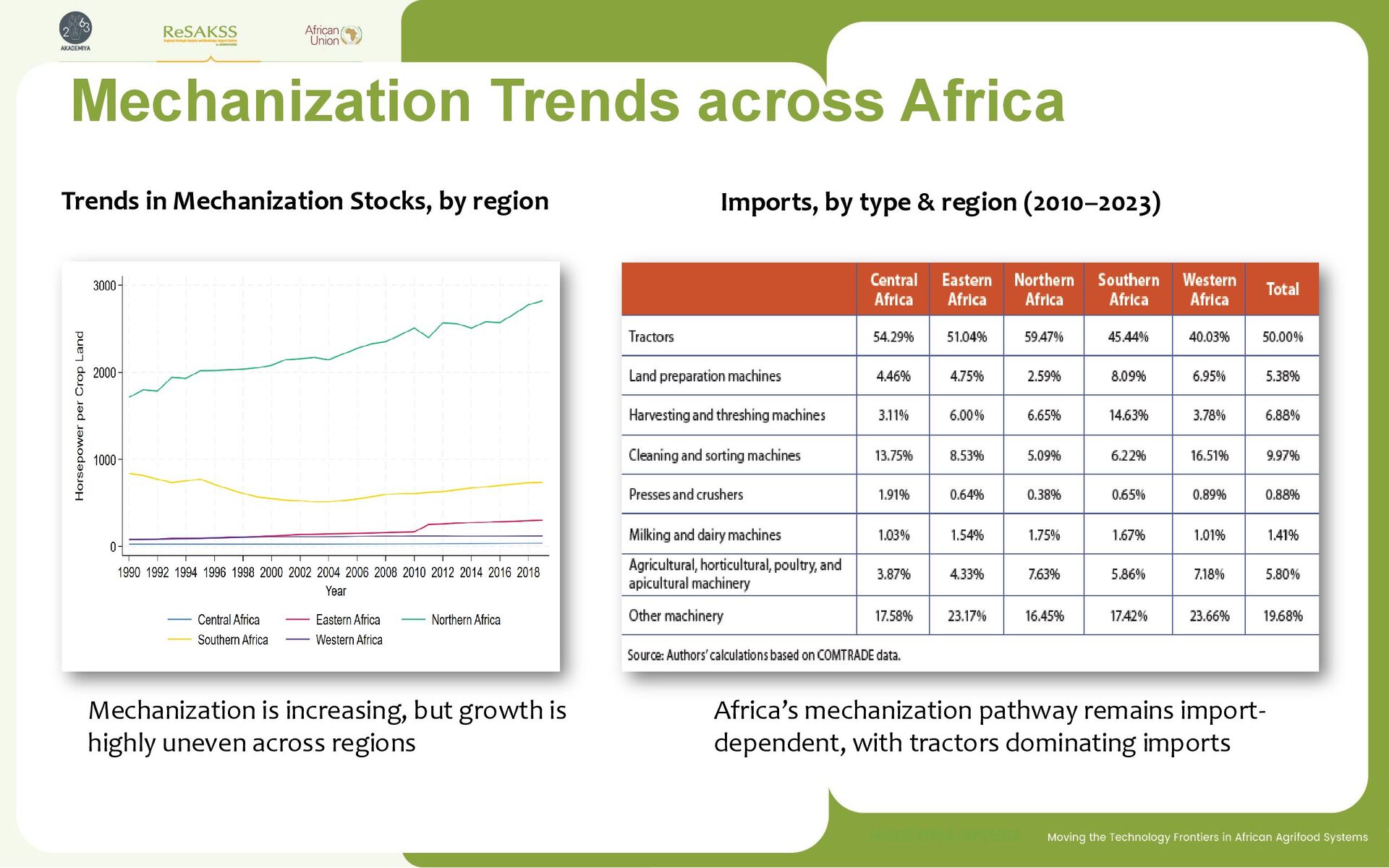 Imports, by type & region (2010–2023) Africa’s mechanization pathway remains import- dependent, with tractors dominating imports Mechanization is increasing, but growth is highly uneven across regions