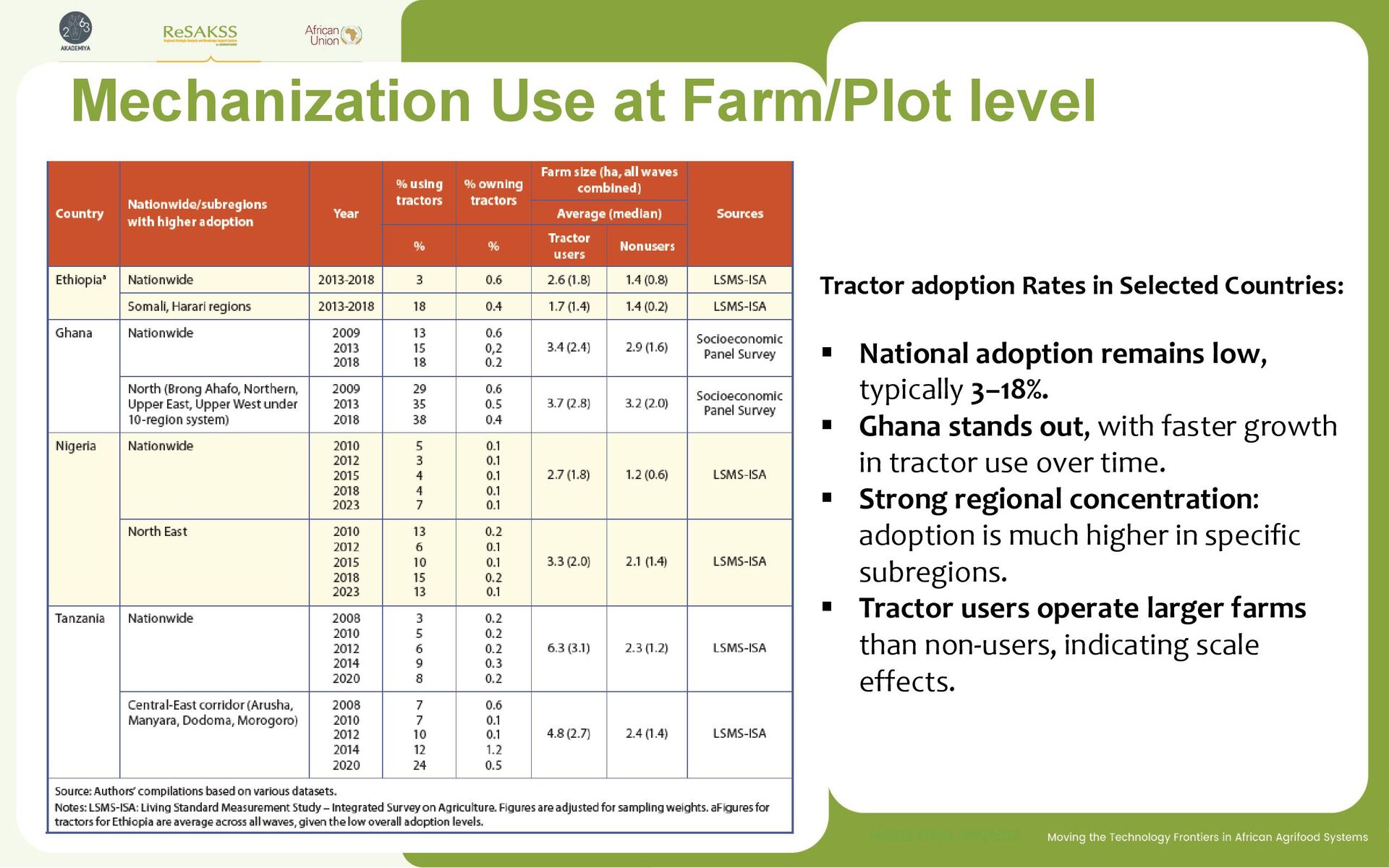 Countries: ▪ National adoption remains low, typically 3–18%. ▪ Ghana stands out, with faster growth in tractor use over time. ▪ Strong regional concentration: adoption is much higher in specific subregions. ▪ Tractor users operate larger farms than non-users, indicating scale effects.