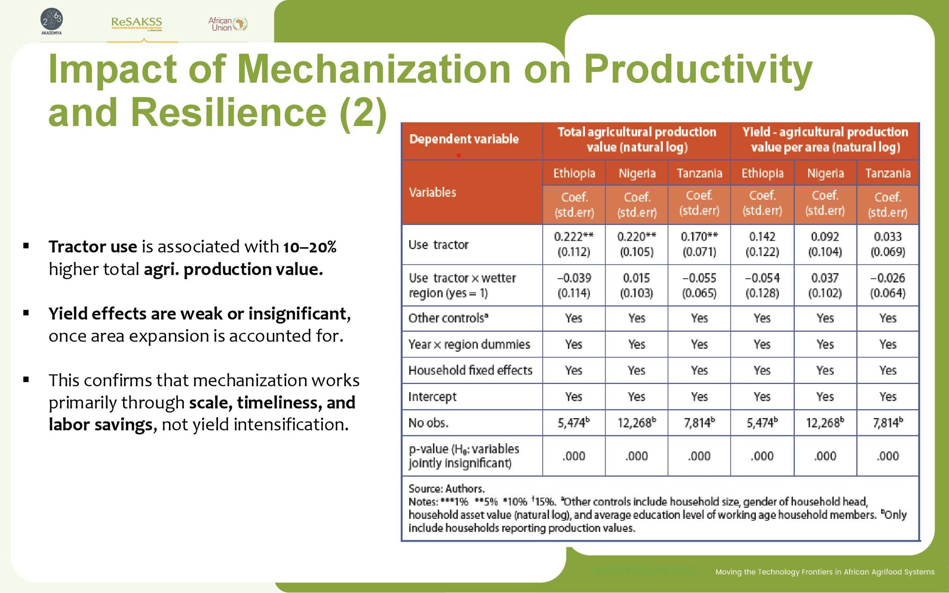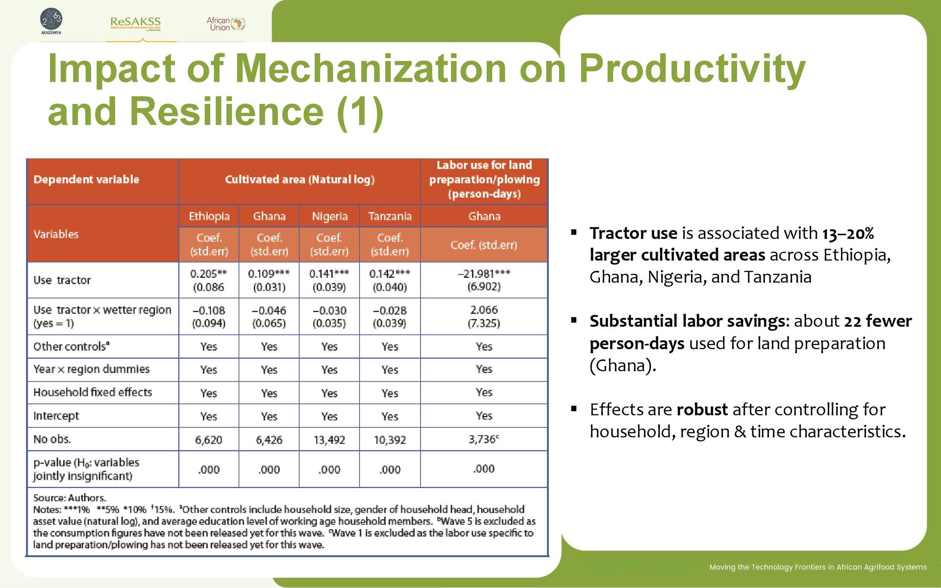 use is associated with 13–20% larger cultivated areas across Ethiopia, Ghana, Nigeria, and Tanzania ▪ Substantial labor savings: about 22 fewer person-days used for land preparation (Ghana). ▪ Effects are robust after controlling for household, region & time characteristics.