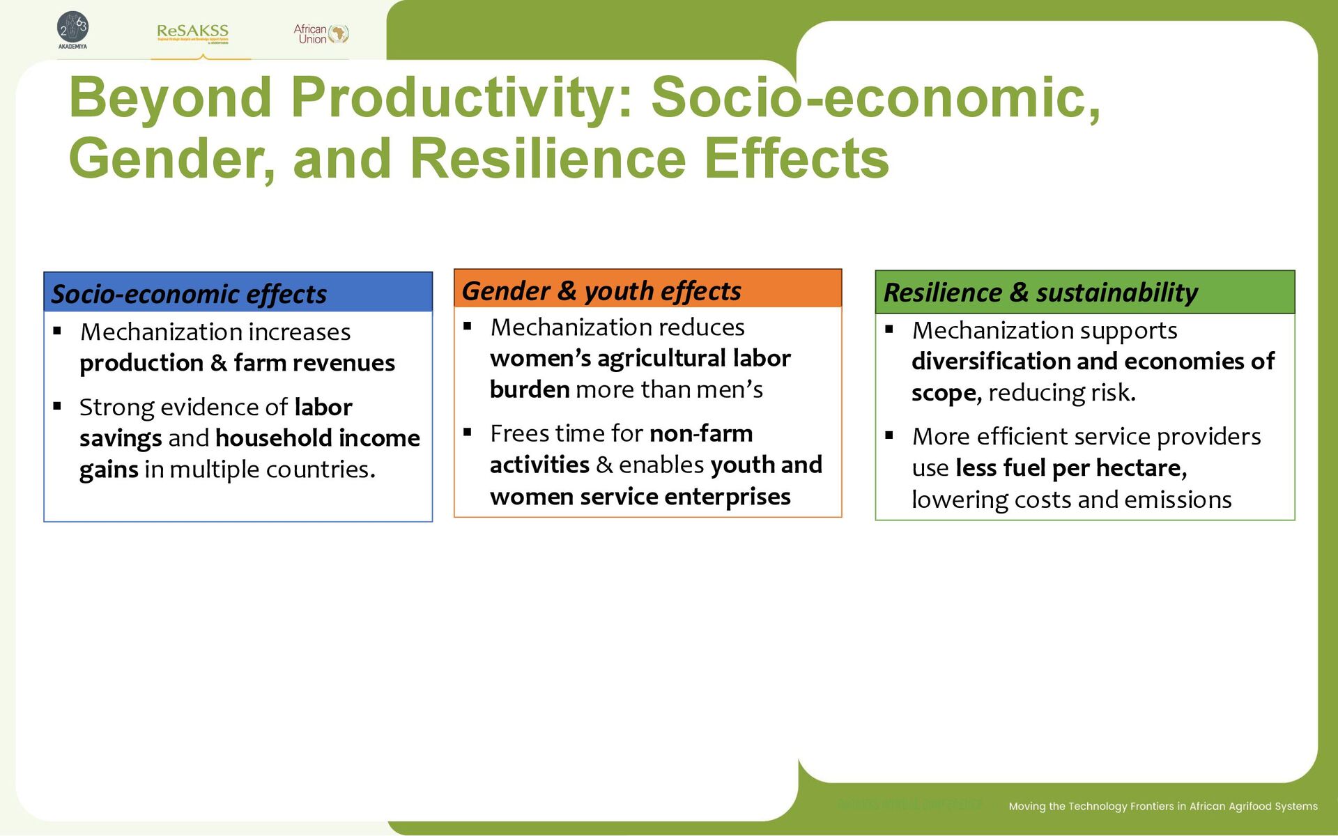 Strong evidence of labor savings and household income gains in multiple countries. Gender & youth effects ▪ Mechanization reduces women’s agricultural labor burden more than men’s ▪ Frees time for non-farm activities & enables youth and women service enterprises ▪ Mechanization supports diversification and economies of scope, reducing risk. ▪ More efficient service providers use less fuel per hectare, lowering costs and emissions Resilience & sustainability Beyond Productivity: Socio-economic, Gender, and Resilience Effects