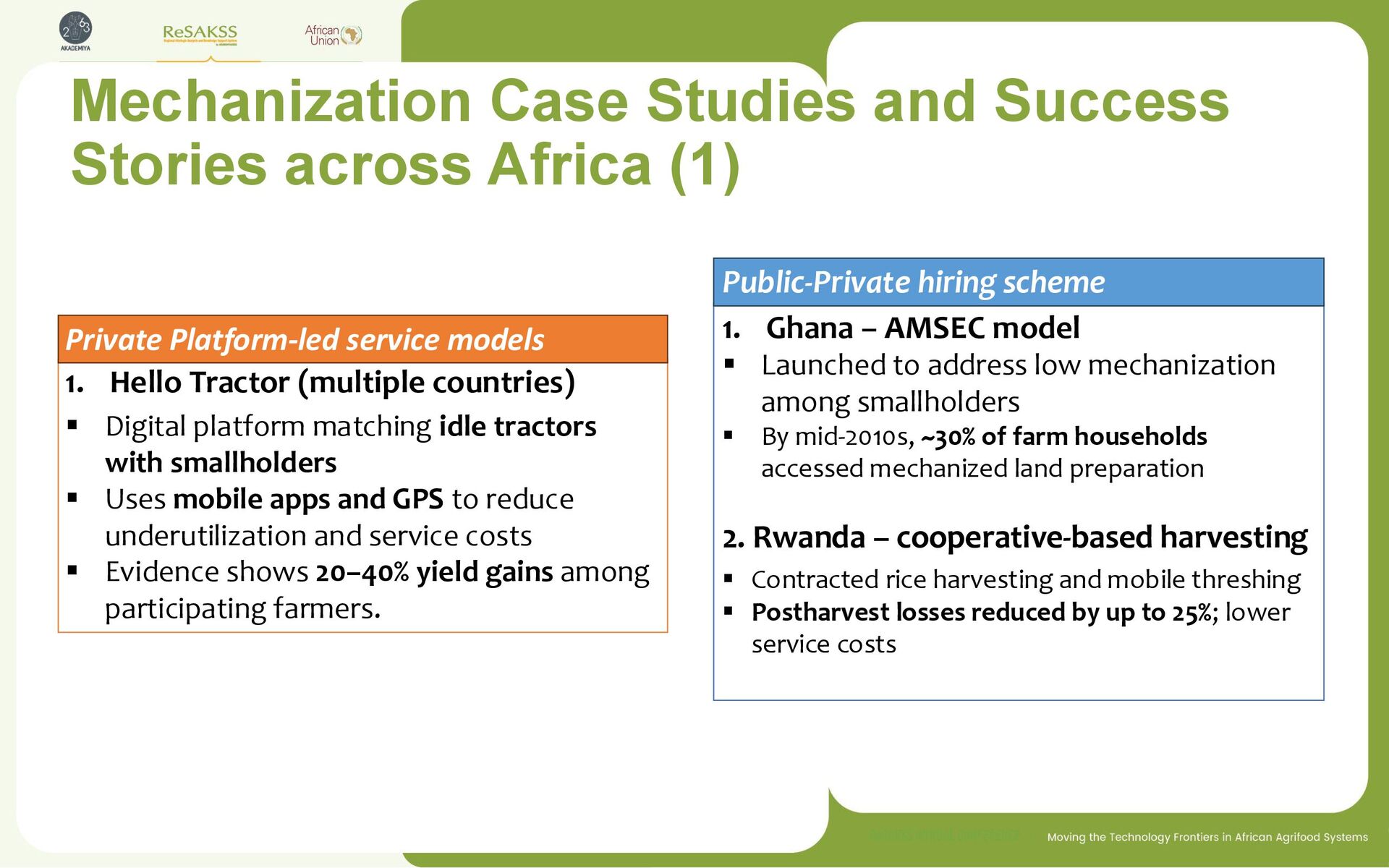 tractors with smallholders ▪ Uses mobile apps and GPS to reduce underutilization and service costs ▪ Evidence shows 20–40% yield gains among participating farmers. 1. Ghana – AMSEC model ▪ Launched to address low mechanization among smallholders ▪ By mid-2010s, ~30% of farm households accessed mechanized land preparation 2. Rwanda – cooperative-based harvesting ▪ Contracted rice harvesting and mobile threshing ▪ Postharvest losses reduced by up to 25%; lower service costs Public-Private hiring scheme Private Platform-led service models Mechanization Case Studies and Success Stories across Africa (1)
