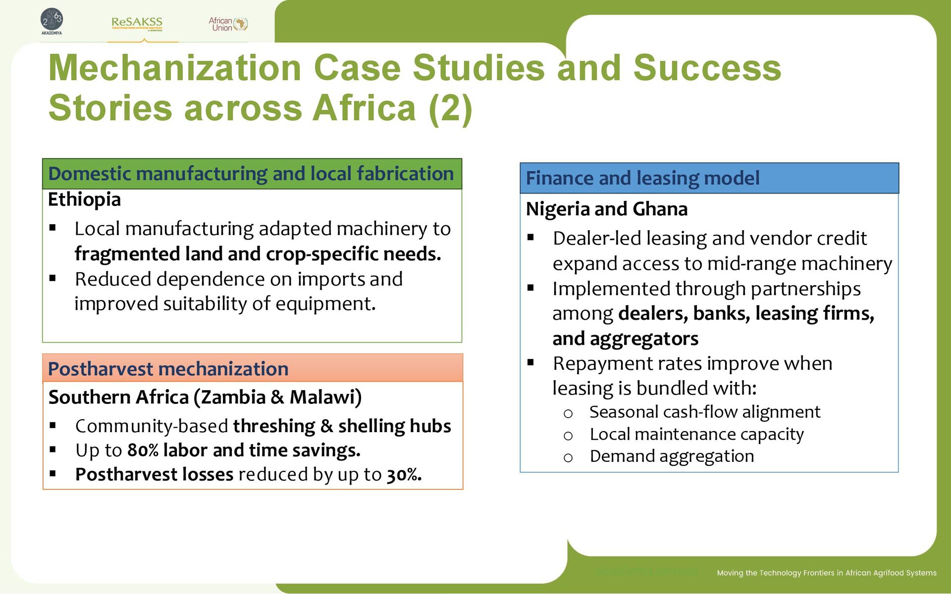 access to mid-range machinery ▪ Implemented through partnerships among dealers, banks, leasing firms, and aggregators ▪ Repayment rates improve when leasing is bundled with: o Seasonal cash-flow alignment o Local maintenance capacity o Demand aggregation Ethiopia ▪ Local manufacturing adapted machinery to fragmented land and crop-specific needs. ▪ Reduced dependence on imports and improved suitability of equipment. Domestic manufacturing and local fabrication Postharvest mechanization Southern Africa (Zambia & Malawi) ▪ Community-based threshing & shelling hubs ▪ Up to 80% labor and time savings. ▪ Postharvest losses reduced by up to 30%. Finance and leasing model Mechanization Case Studies and Success Stories across Africa (2)