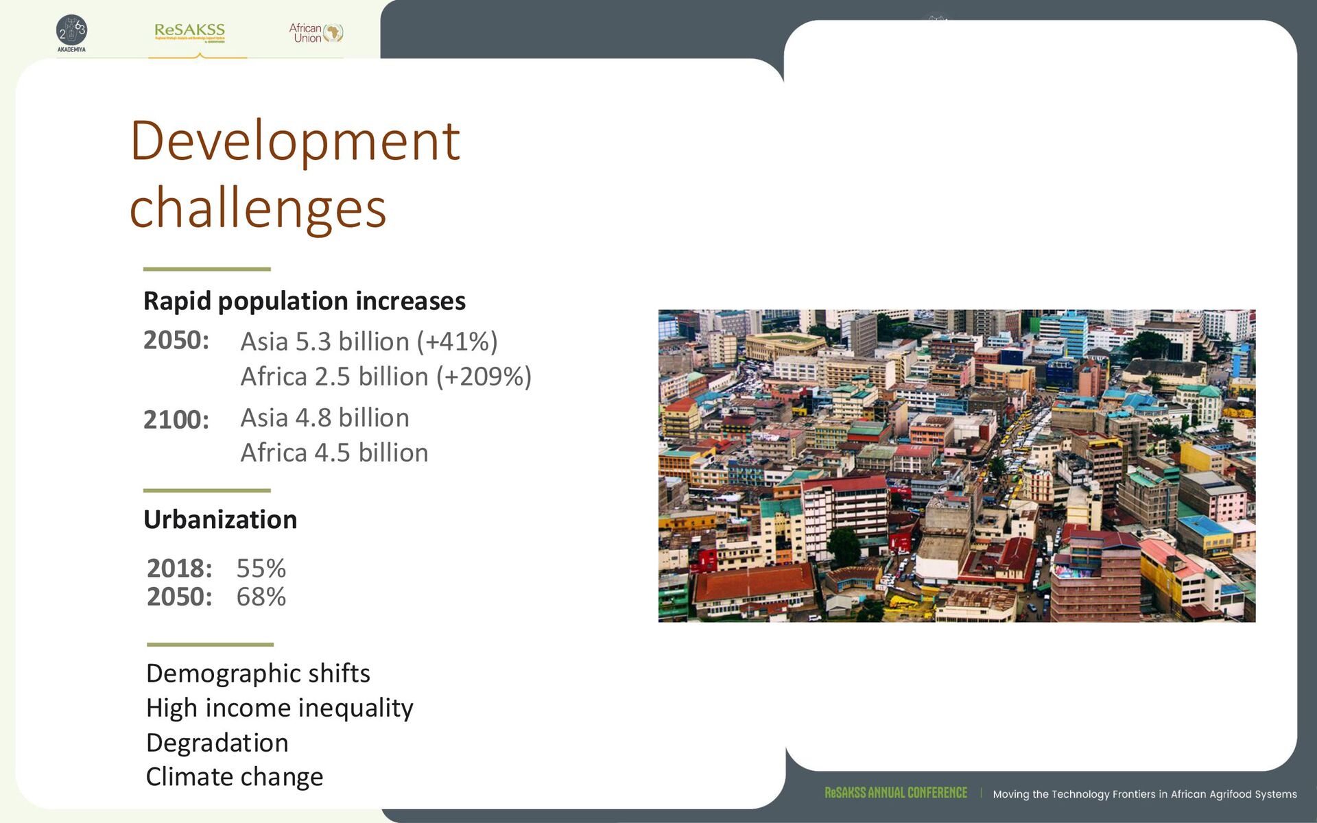 (+41%) Africa 2.5 billion (+209%) 2018: 55% 2050: 68% 2100: Asia 4.8 billion Africa 4.5 billion Demographic shifts High income inequality Degradation Climate change
