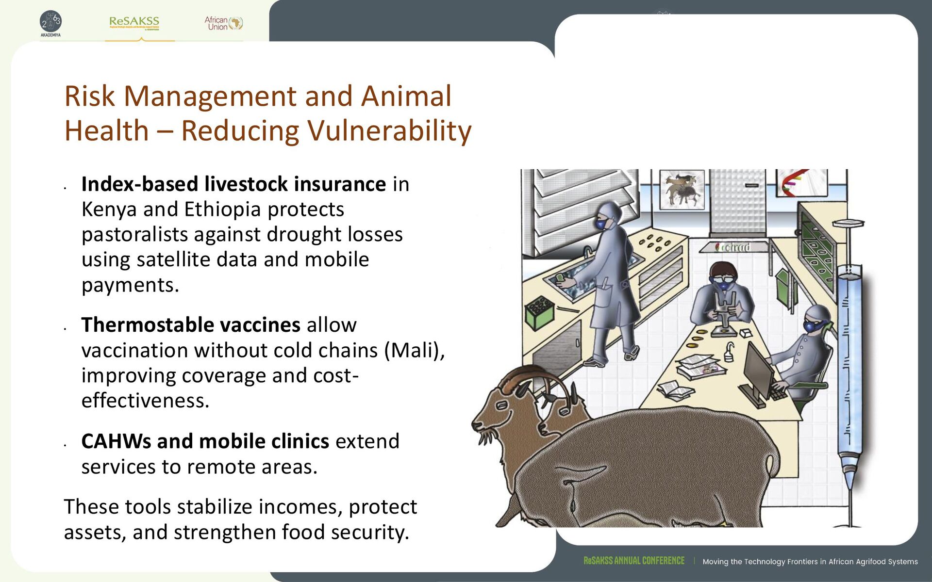 livestock insurance in Kenya and Ethiopia protects pastoralists against drought losses using satellite data and mobile payments. • Thermostable vaccines allow vaccination without cold chains (Mali), improving coverage and cost- effectiveness. • CAHWs and mobile clinics extend services to remote areas. These tools stabilize incomes, protect assets, and strengthen food security.