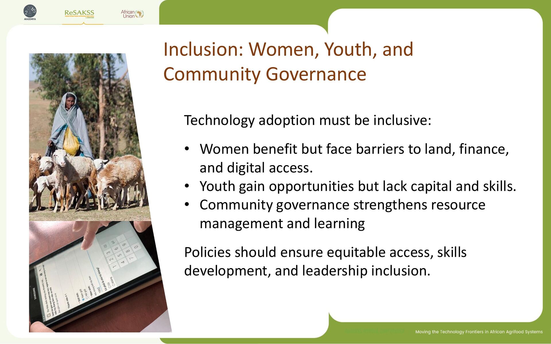 barriers to land, finance, and digital access. • Youth gain opportunities but lack capital and skills. • Community governance strengthens resource management and learning Policies should ensure equitable access, skills development, and leadership inclusion. Inclusion: Women, Youth, and Community Governance
