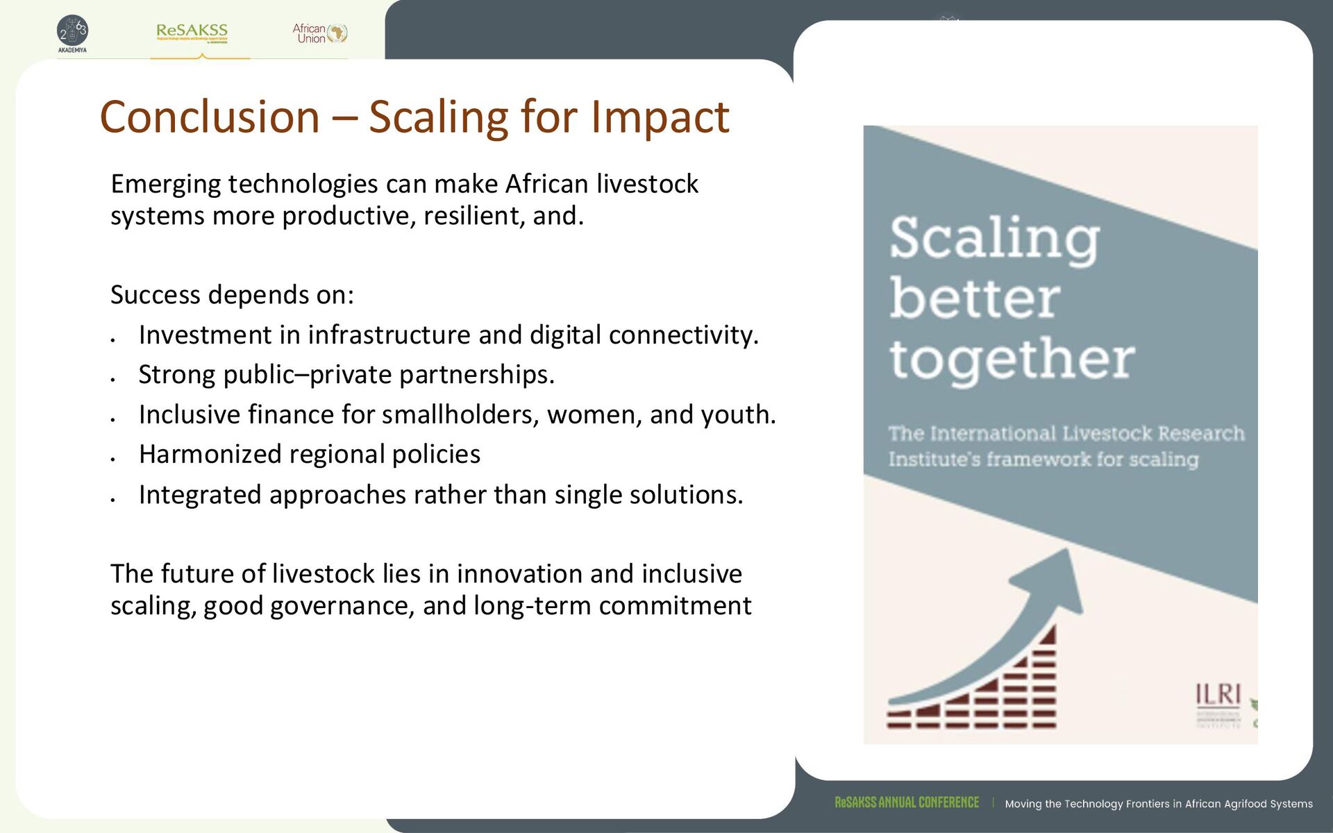 livestock systems more productive, resilient, and. Success depends on: • Investment in infrastructure and digital connectivity. • Strong public–private partnerships. • Inclusive finance for smallholders, women, and youth. • Harmonized regional policies • Integrated approaches rather than single solutions. The future of livestock lies in innovation and inclusive scaling, good governance, and long-term commitment