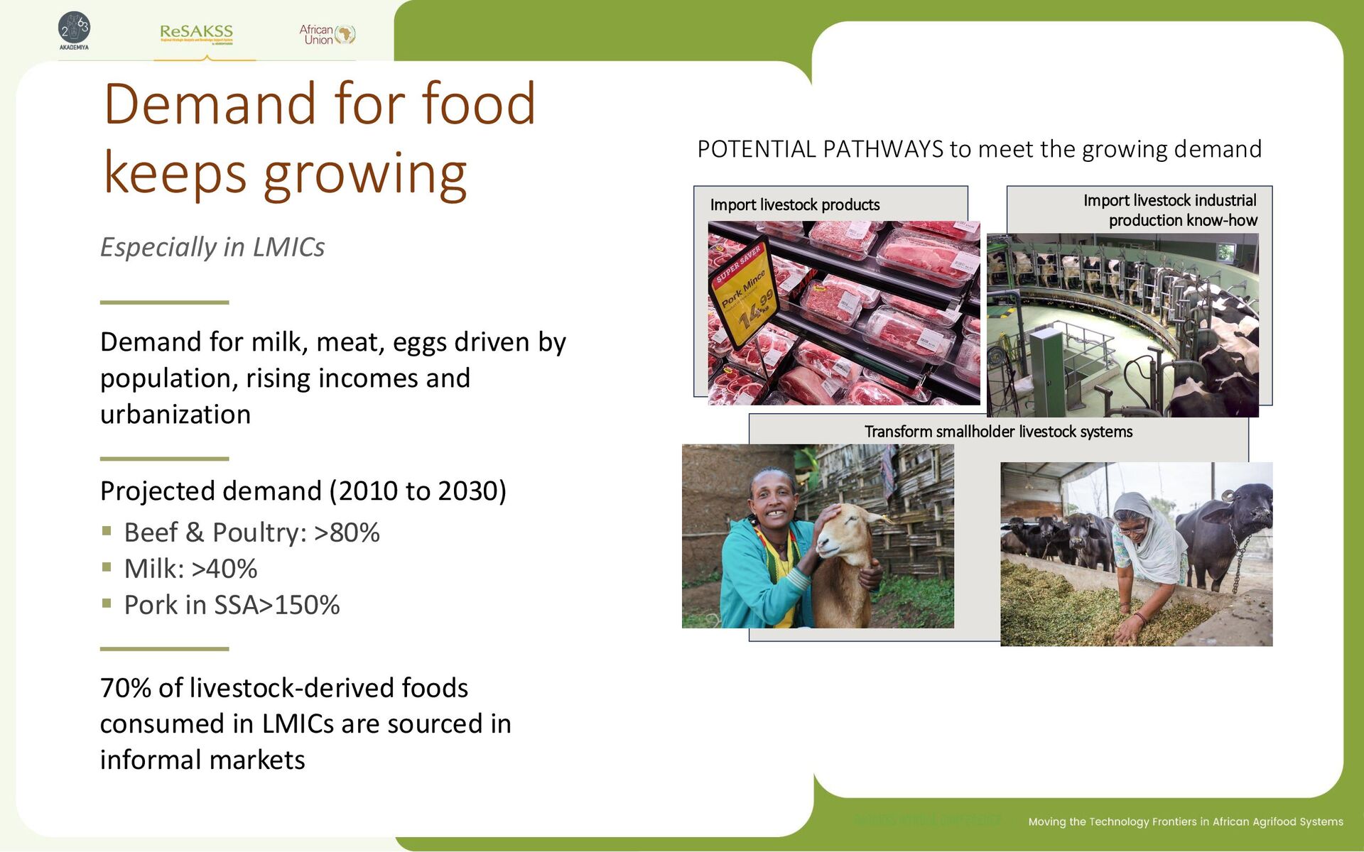 growing demand Import livestock products Import livestock industrial production know-how Transform smallholder livestock systems Demand for milk, meat, eggs driven by population, rising incomes and urbanization Projected demand (2010 to 2030) ▪ Beef & Poultry: >80% ▪ Milk: >40% ▪ Pork in SSA>150% 70% of livestock-derived foods consumed in LMICs are sourced in informal markets Especially in LMICs