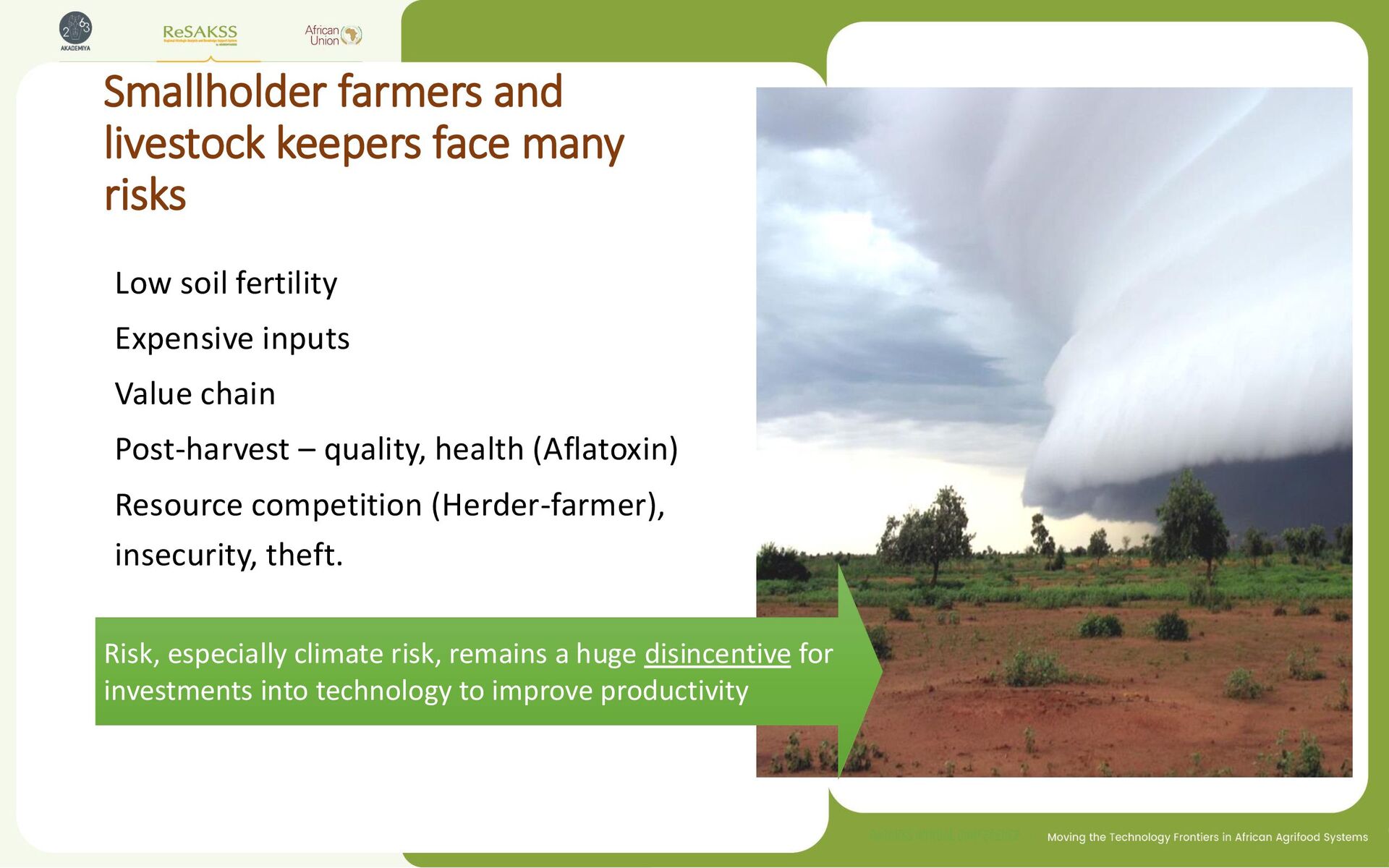 fertility Expensive inputs Value chain Post-harvest – quality, health (Aflatoxin) Resource competition (Herder-farmer), insecurity, theft. Risk, especially climate risk, remains a huge disincentive for investments into technology to improve productivity