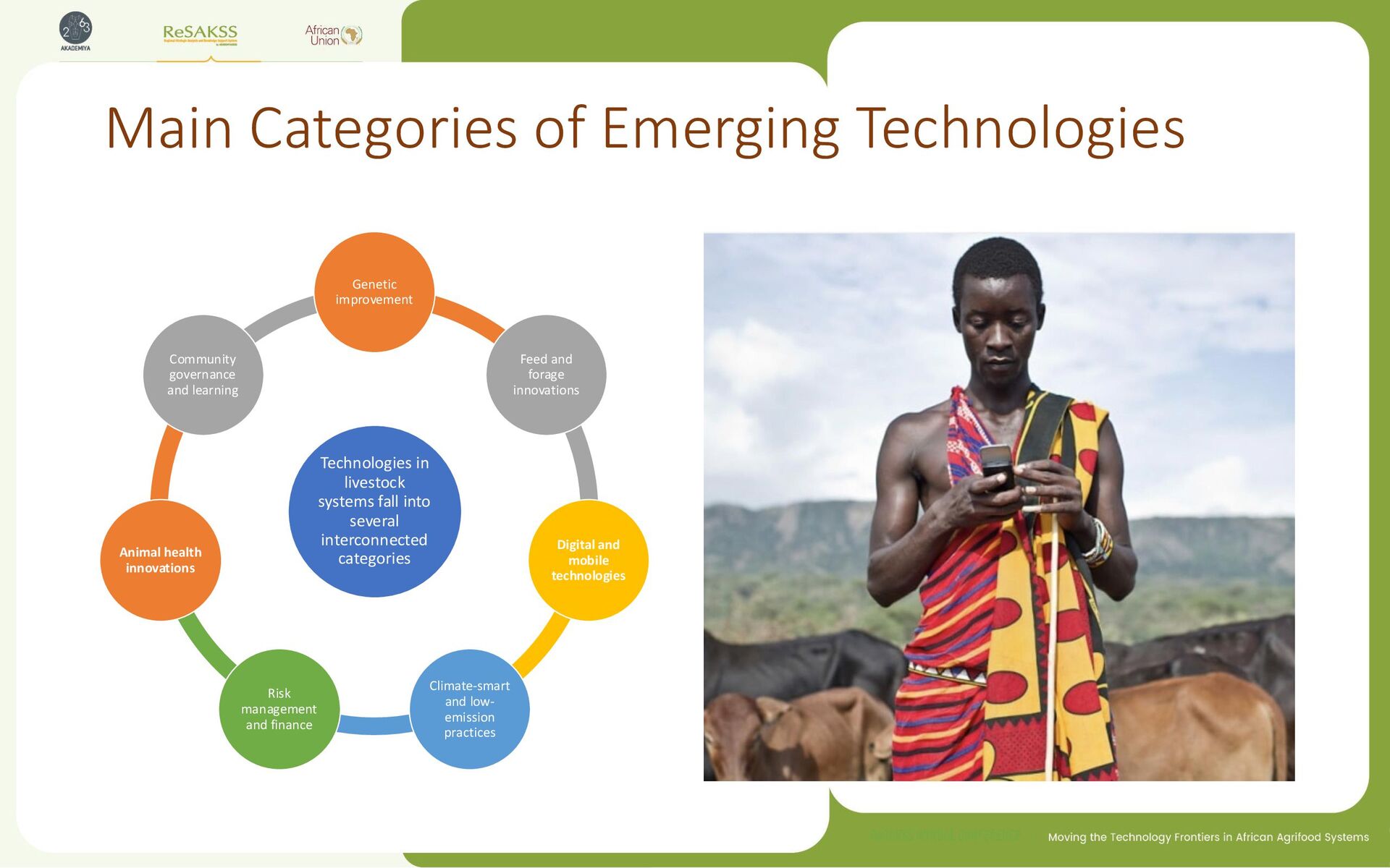 into several interconnected categories Genetic improvement Feed and forage innovations Digital and mobile technologies Climate-smart and low- emission practices Risk management and finance Animal health innovations Community governance and learning