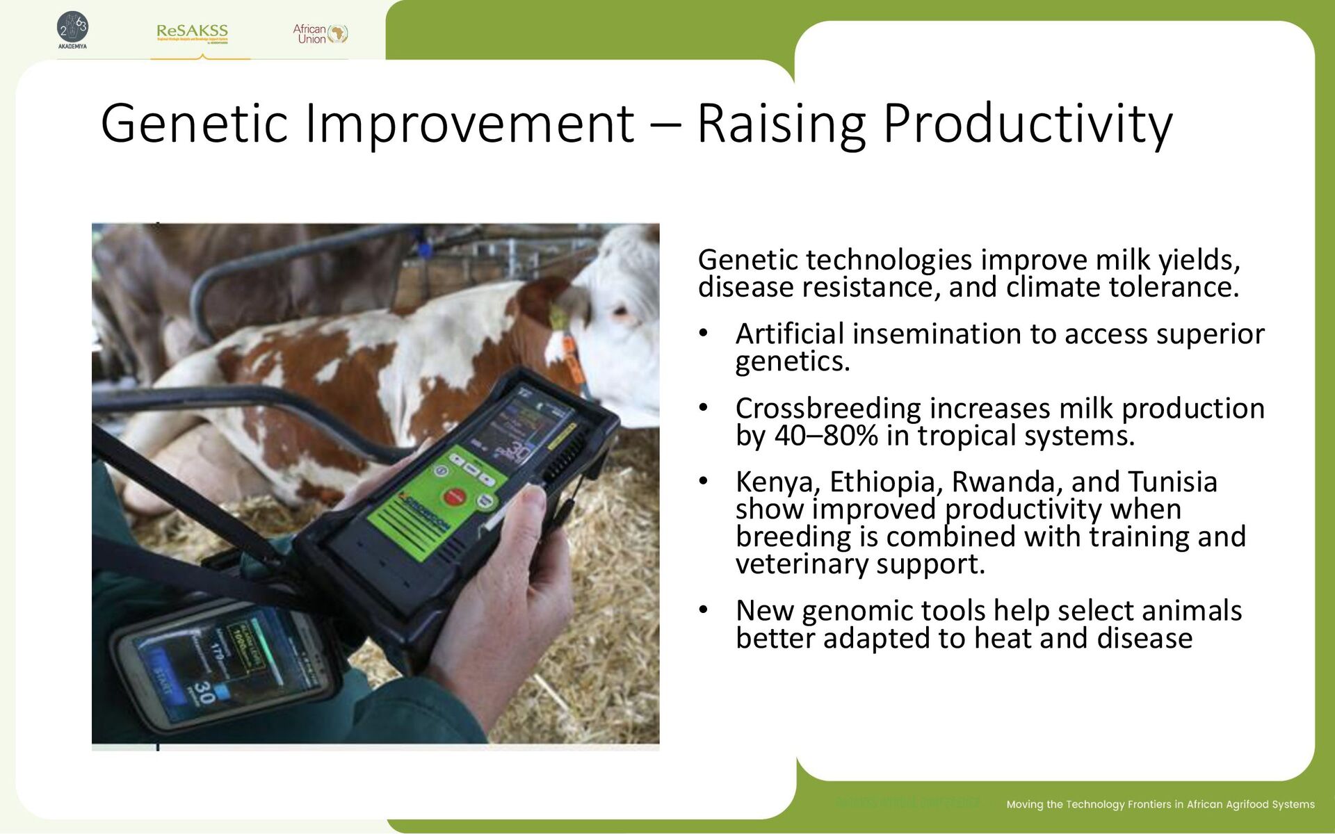 disease resistance, and climate tolerance. • Artificial insemination to access superior genetics. • Crossbreeding increases milk production by 40–80% in tropical systems. • Kenya, Ethiopia, Rwanda, and Tunisia show improved productivity when breeding is combined with training and veterinary support. • New genomic tools help select animals better adapted to heat and disease