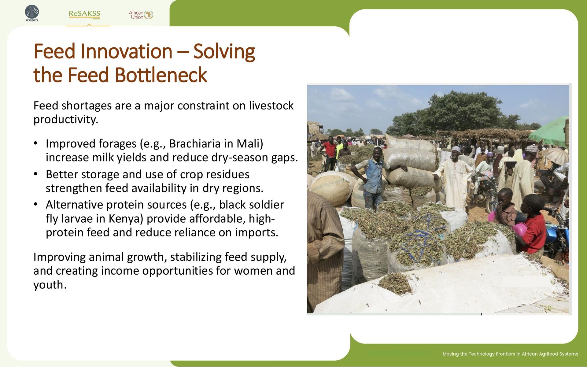 a major constraint on livestock productivity. • Improved forages (e.g., Brachiaria in Mali) increase milk yields and reduce dry-season gaps. • Better storage and use of crop residues strengthen feed availability in dry regions. • Alternative protein sources (e.g., black soldier fly larvae in Kenya) provide affordable, high- protein feed and reduce reliance on imports. Improving animal growth, stabilizing feed supply, and creating income opportunities for women and youth.