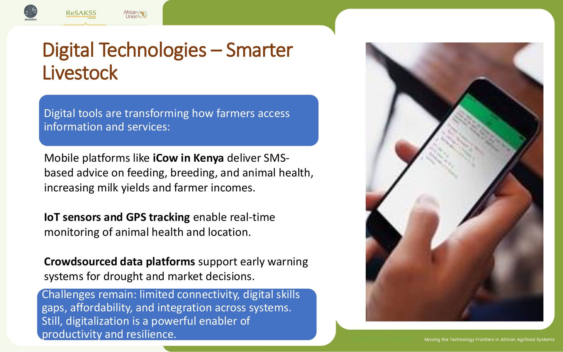 farmers access information and services: Challenges remain: limited connectivity, digital skills gaps, affordability, and integration across systems. Still, digitalization is a powerful enabler of productivity and resilience. Mobile platforms like iCow in Kenya deliver SMS- based advice on feeding, breeding, and animal health, increasing milk yields and farmer incomes. IoT sensors and GPS tracking enable real-time monitoring of animal health and location. Crowdsourced data platforms support early warning systems for drought and market decisions.