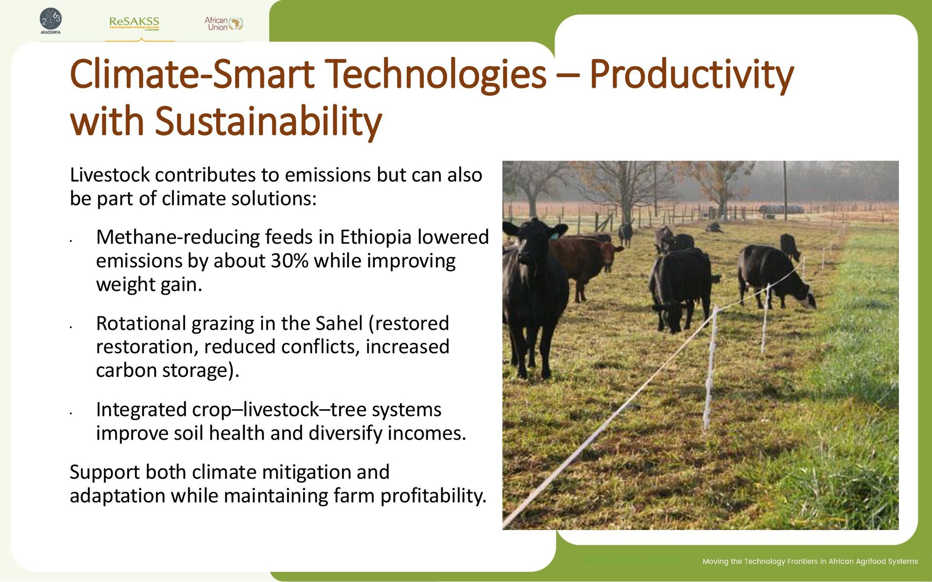 but can also be part of climate solutions: • Methane-reducing feeds in Ethiopia lowered emissions by about 30% while improving weight gain. • Rotational grazing in the Sahel (restored restoration, reduced conflicts, increased carbon storage). • Integrated crop–livestock–tree systems improve soil health and diversify incomes. Support both climate mitigation and adaptation while maintaining farm profitability.