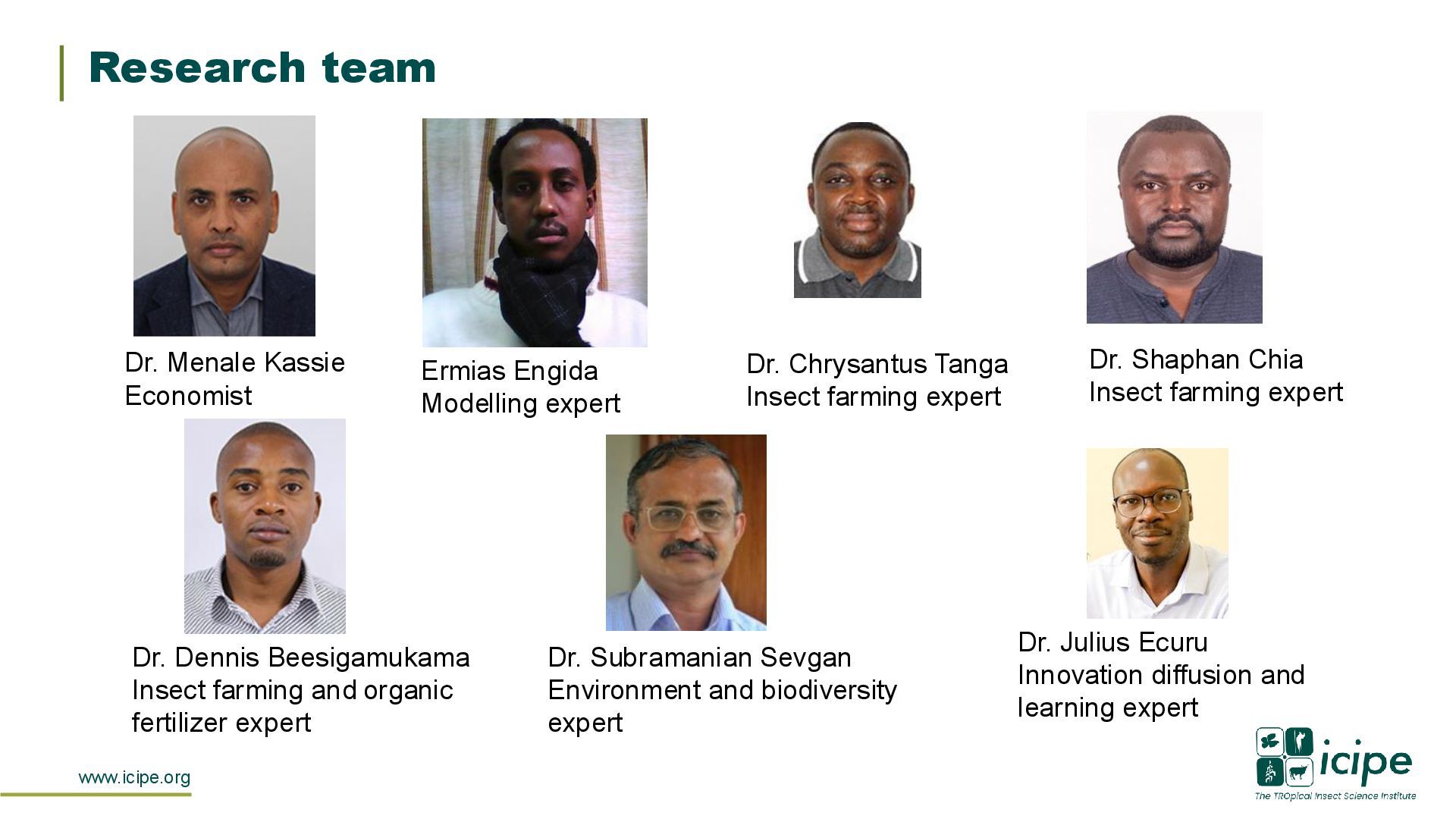 expert Dr. Chrysantus Tanga Insect farming expert Dr. Shaphan Chia Insect farming expert Dr. Dennis Beesigamukama Insect farming and organic fertilizer expert Dr. Subramanian Sevgan Environment and biodiversity expert Dr. Julius Ecuru Innovation diffusion and learning expert