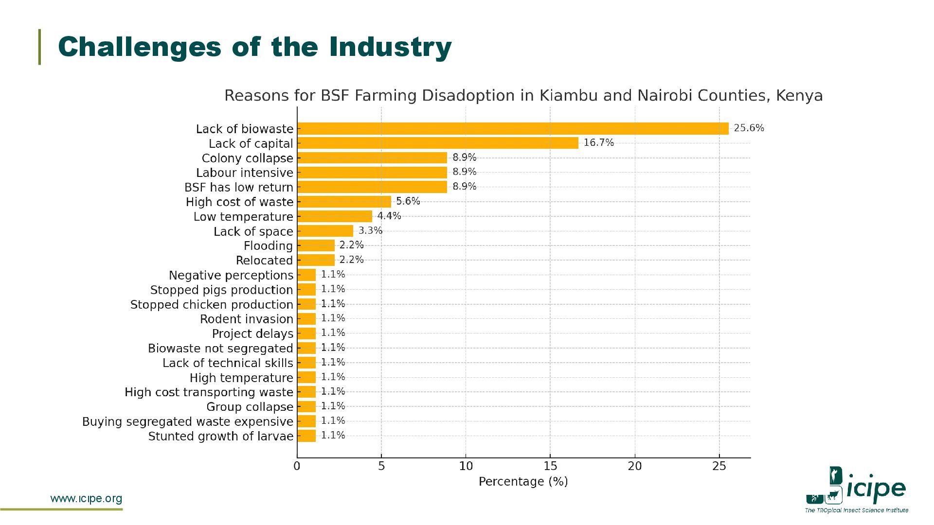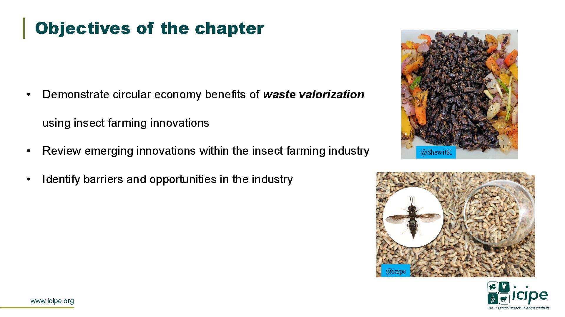of waste valorization using insect farming innovations • Review emerging innovations within the insect farming industry • Identify barriers and opportunities in the industry @ShewitK @icipe