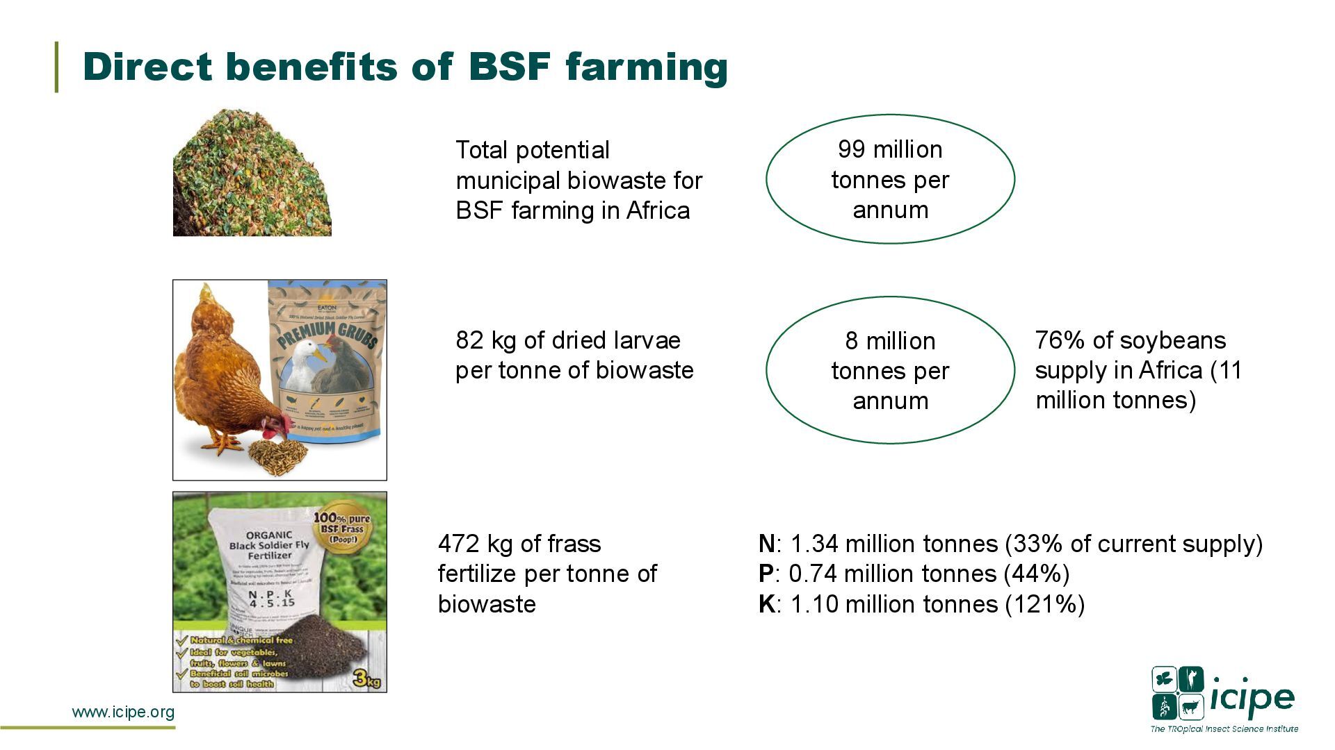 for BSF farming in Africa 99 million tonnes per annum 82 kg of dried larvae per tonne of biowaste 472 kg of frass fertilize per tonne of biowaste 8 million tonnes per annum 76% of soybeans supply in Africa (11 million tonnes) N: 1.34 million tonnes (33% of current supply) P: 0.74 million tonnes (44%) K: 1.10 million tonnes (121%)