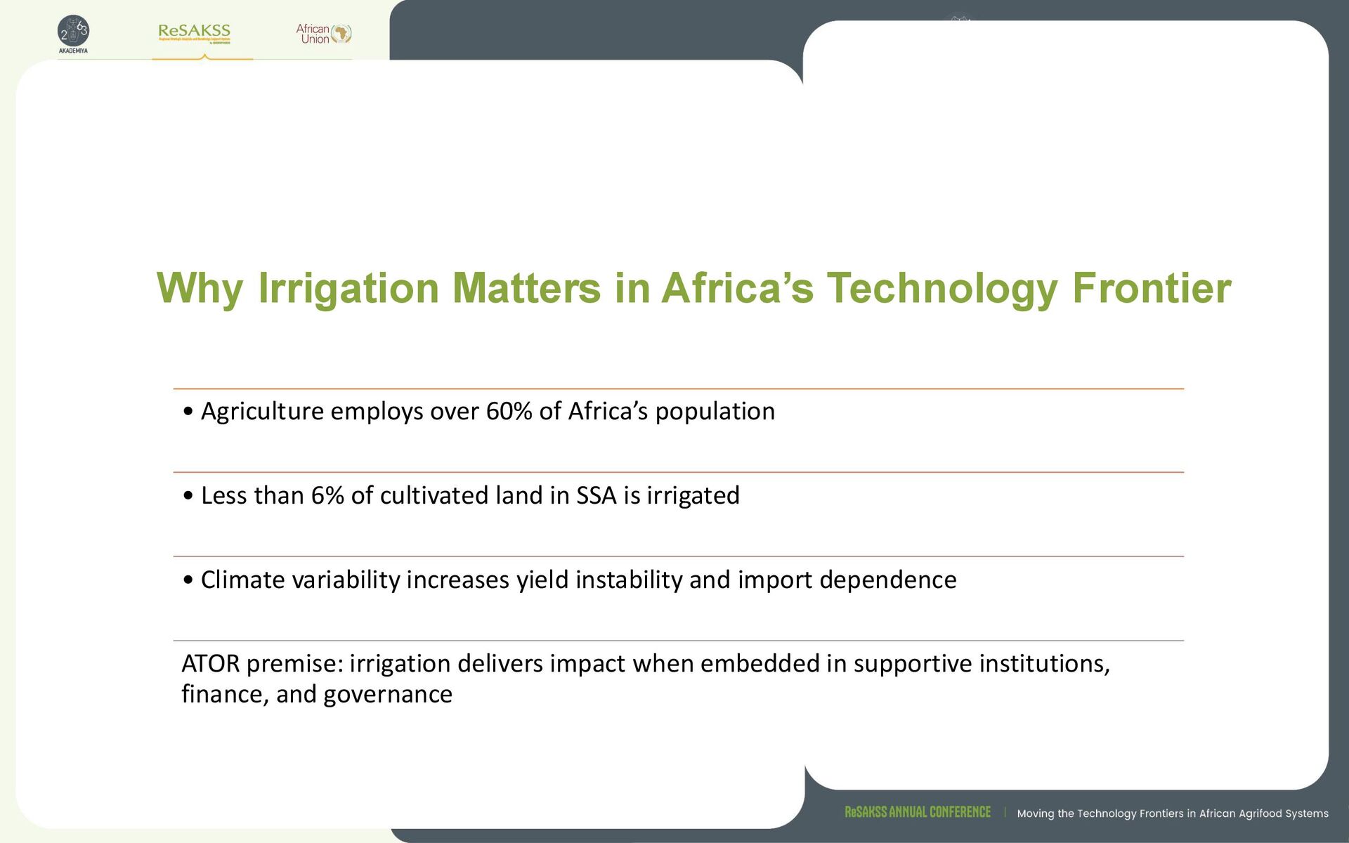 over 60% of Africa’s population • Less than 6% of cultivated land in SSA is irrigated • Climate variability increases yield instability and import dependence ATOR premise: irrigation delivers impact when embedded in supportive institutions, finance, and governance