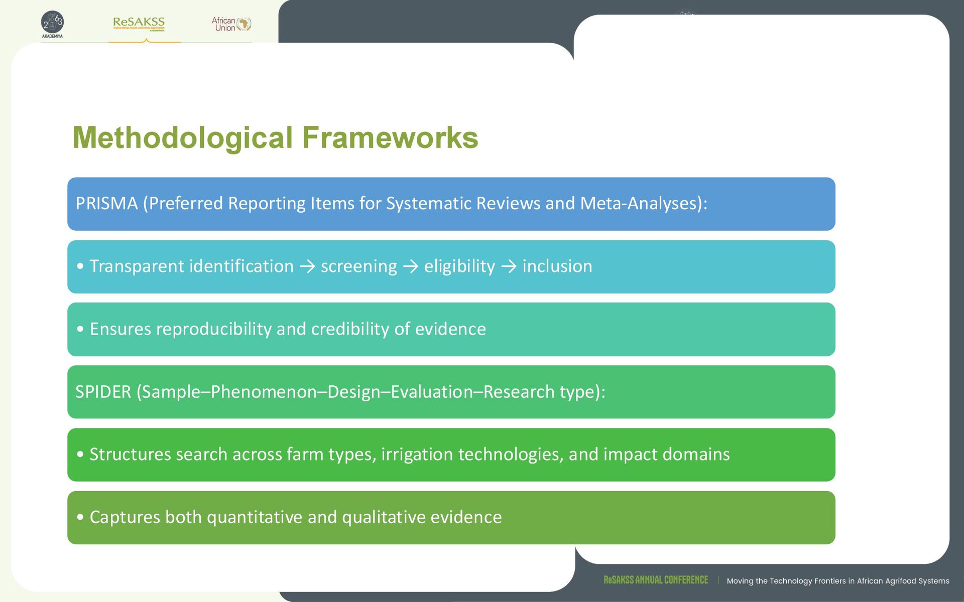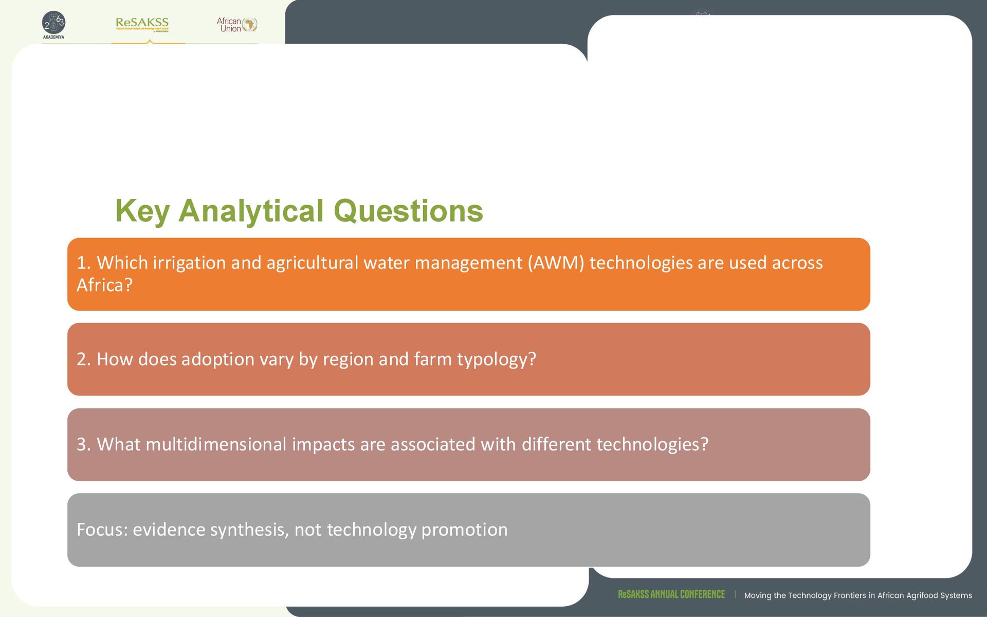 (AWM) technologies are used across Africa? 2. How does adoption vary by region and farm typology? 3. What multidimensional impacts are associated with different technologies? Focus: evidence synthesis, not technology promotion