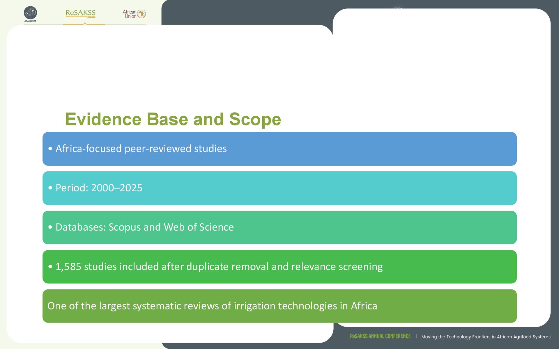 2000–2025 • Databases: Scopus and Web of Science • 1,585 studies included after duplicate removal and relevance screening One of the largest systematic reviews of irrigation technologies in Africa