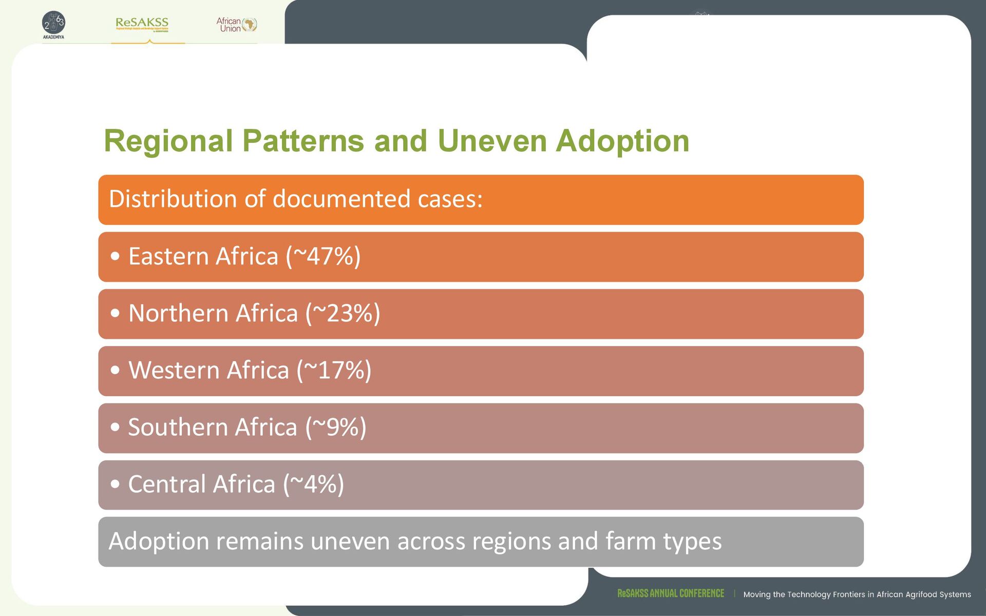 Eastern Africa (~47%) • Northern Africa (~23%) • Western Africa (~17%) • Southern Africa (~9%) • Central Africa (~4%) Adoption remains uneven across regions and farm types