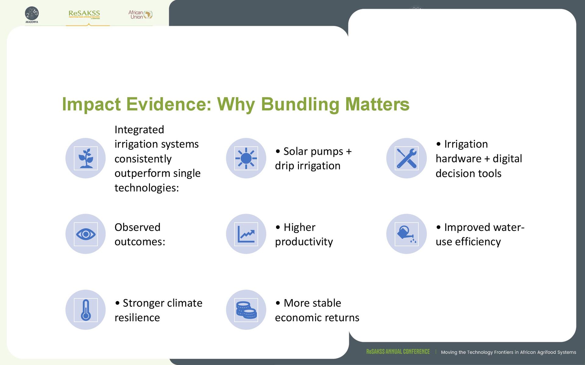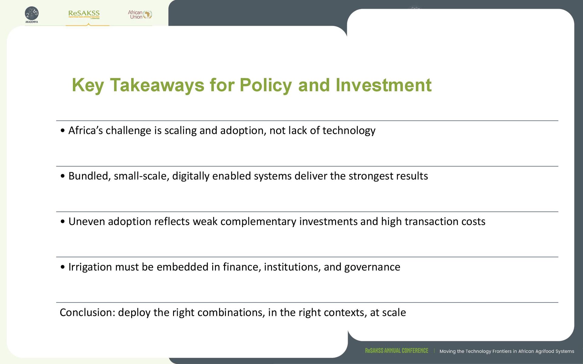 scaling and adoption, not lack of technology • Bundled, small-scale, digitally enabled systems deliver the strongest results • Uneven adoption reflects weak complementary investments and high transaction costs • Irrigation must be embedded in finance, institutions, and governance Conclusion: deploy the right combinations, in the right contexts, at scale