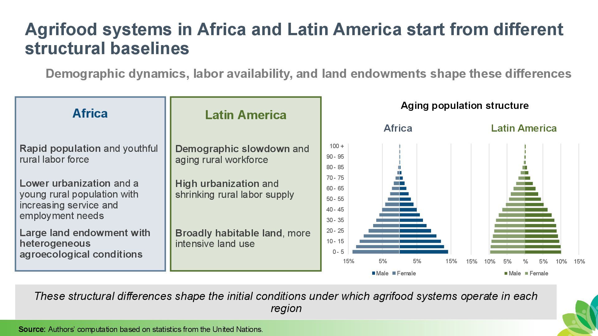 structural baselines Demographic dynamics, labor availability, and land endowments shape these differences Africa Latin America Rapid population and youthful rural labor force Demographic slowdown and aging rural workforce Lower urbanization and a young rural population with increasing service and employment needs High urbanization and shrinking rural labor supply Large land endowment with heterogeneous agroecological conditions Broadly habitable land, more intensive land use These structural differences shape the initial conditions under which agrifood systems operate in each region 15% 5% 5% 15% 0 - 5 10 - 15 20 - 25 30 - 35 40 - 45 50 - 55 60 - 65 70 - 75 80 - 85 90 - 95 100 + Male Female 15% 10% 5% % 5% 10% 15% Male Female Africa Latin America Aging population structure Source: Authors’ computation based on statistics from the United Nations.