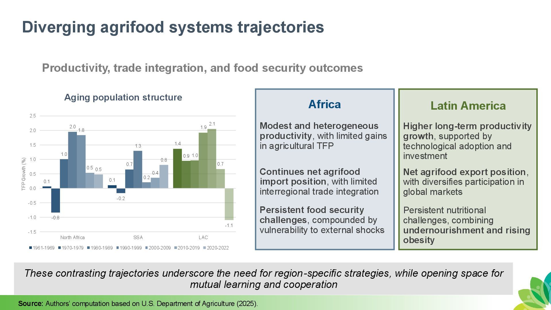 outcomes Africa Latin America Modest and heterogeneous productivity, with limited gains in agricultural TFP Higher long-term productivity growth, supported by technological adoption and investment Continues net agrifood import position, with limited interregional trade integration Net agrifood export position, with diversifies participation in global markets Persistent food security challenges, compounded by vulnerability to external shocks Persistent nutritional challenges, combining undernourishment and rising obesity 0.1 0.1 1.4 -0.8 -0.2 0.9 1.0 0.7 1.0 2.0 1.3 1.9 1.8 0.2 2.1 0.5 0.4 0.7 0.5 0.8 -1.1 -1.5 -1.0 -0.5 0.0 0.5 1.0 1.5 2.0 2.5 North Africa SSA LAC TFP Growth (%) 1961-1969 1970-1979 1980-1989 1990-1999 2000-2009 2010-2019 2020-2022 Aging population structure These contrasting trajectories underscore the need for region-specific strategies, while opening space for mutual learning and cooperation Source: Authors’ computation based on U.S. Department of Agriculture (2025).