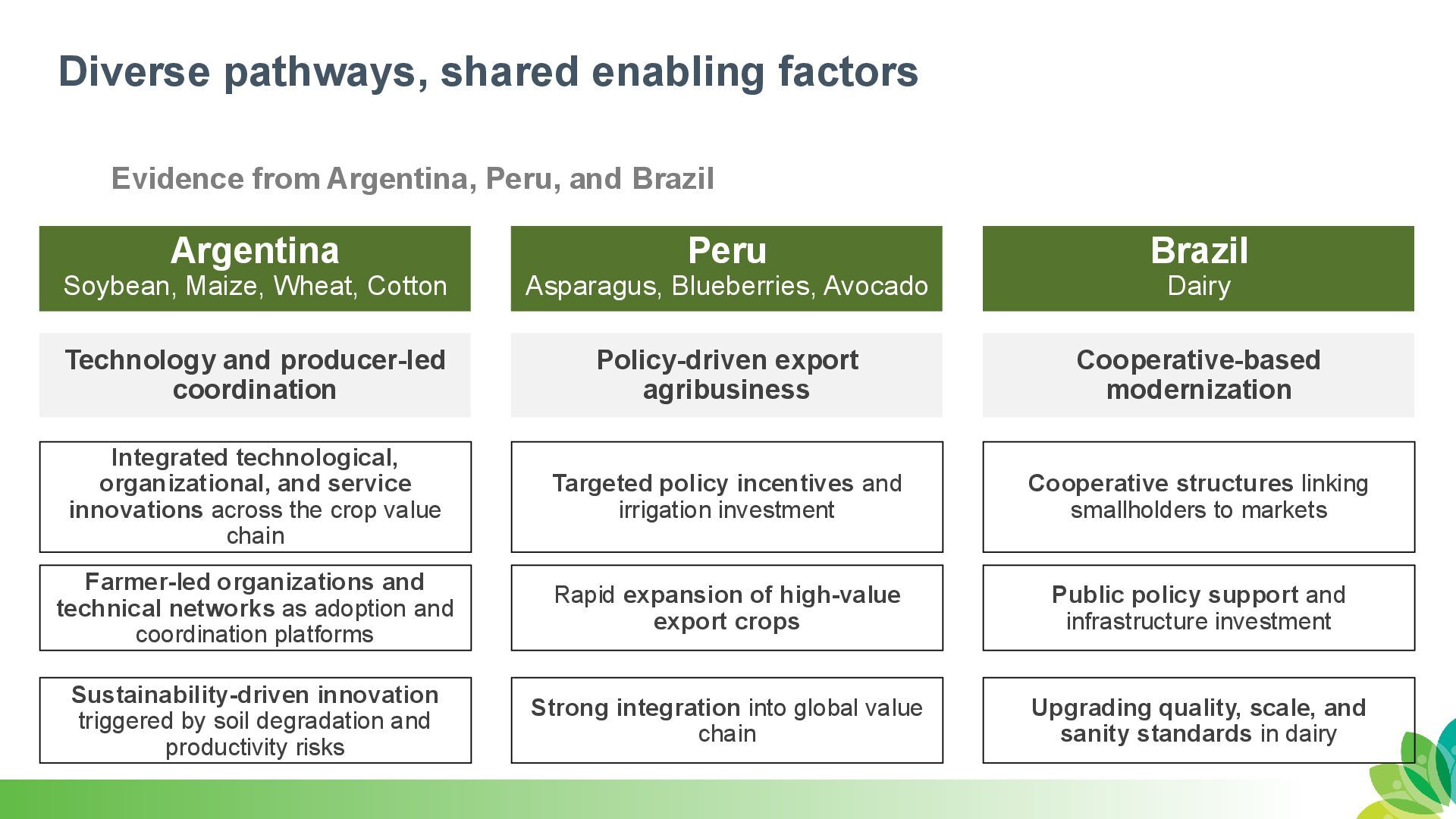 Brazil Argentina Soybean, Maize, Wheat, Cotton Peru Asparagus, Blueberries, Avocado Technology and producer-led coordination Policy-driven export agribusiness Brazil Dairy Cooperative-based modernization Integrated technological, organizational, and service innovations across the crop value chain Targeted policy incentives and irrigation investment Cooperative structures linking smallholders to markets Sustainability-driven innovation triggered by soil degradation and productivity risks Strong integration into global value chain Upgrading quality, scale, and sanity standards in dairy Farmer-led organizations and technical networks as adoption and coordination platforms Rapid expansion of high-value export crops Public policy support and infrastructure investment