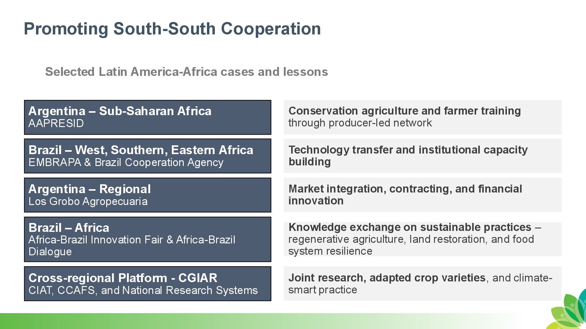 – Sub-Saharan Africa AAPRESID Brazil – West, Southern, Eastern Africa EMBRAPA & Brazil Cooperation Agency Argentina – Regional Los Grobo Agropecuaria Brazil – Africa Africa-Brazil Innovation Fair & Africa-Brazil Dialogue Cross-regional Platform - CGIAR CIAT, CCAFS, and National Research Systems Conservation agriculture and farmer training through producer-led network Technology transfer and institutional capacity building Market integration, contracting, and financial innovation Joint research, adapted crop varieties, and climate- smart practice Knowledge exchange on sustainable practices – regenerative agriculture, land restoration, and food system resilience