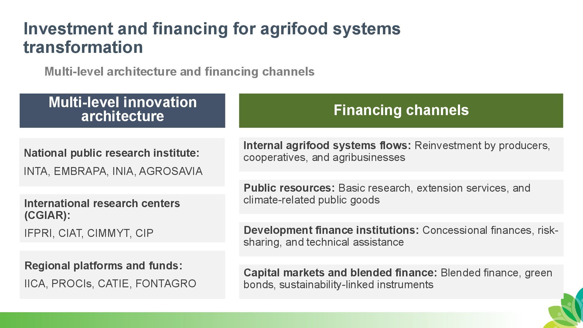 financing channels Multi-level innovation architecture Financing channels National public research institute: INTA, EMBRAPA, INIA, AGROSAVIA Internal agrifood systems flows: Reinvestment by producers, cooperatives, and agribusinesses International research centers (CGIAR): IFPRI, CIAT, CIMMYT, CIP Public resources: Basic research, extension services, and climate-related public goods Regional platforms and funds: IICA, PROCIs, CATIE, FONTAGRO Development finance institutions: Concessional finances, risk- sharing, and technical assistance Capital markets and blended finance: Blended finance, green bonds, sustainability-linked instruments