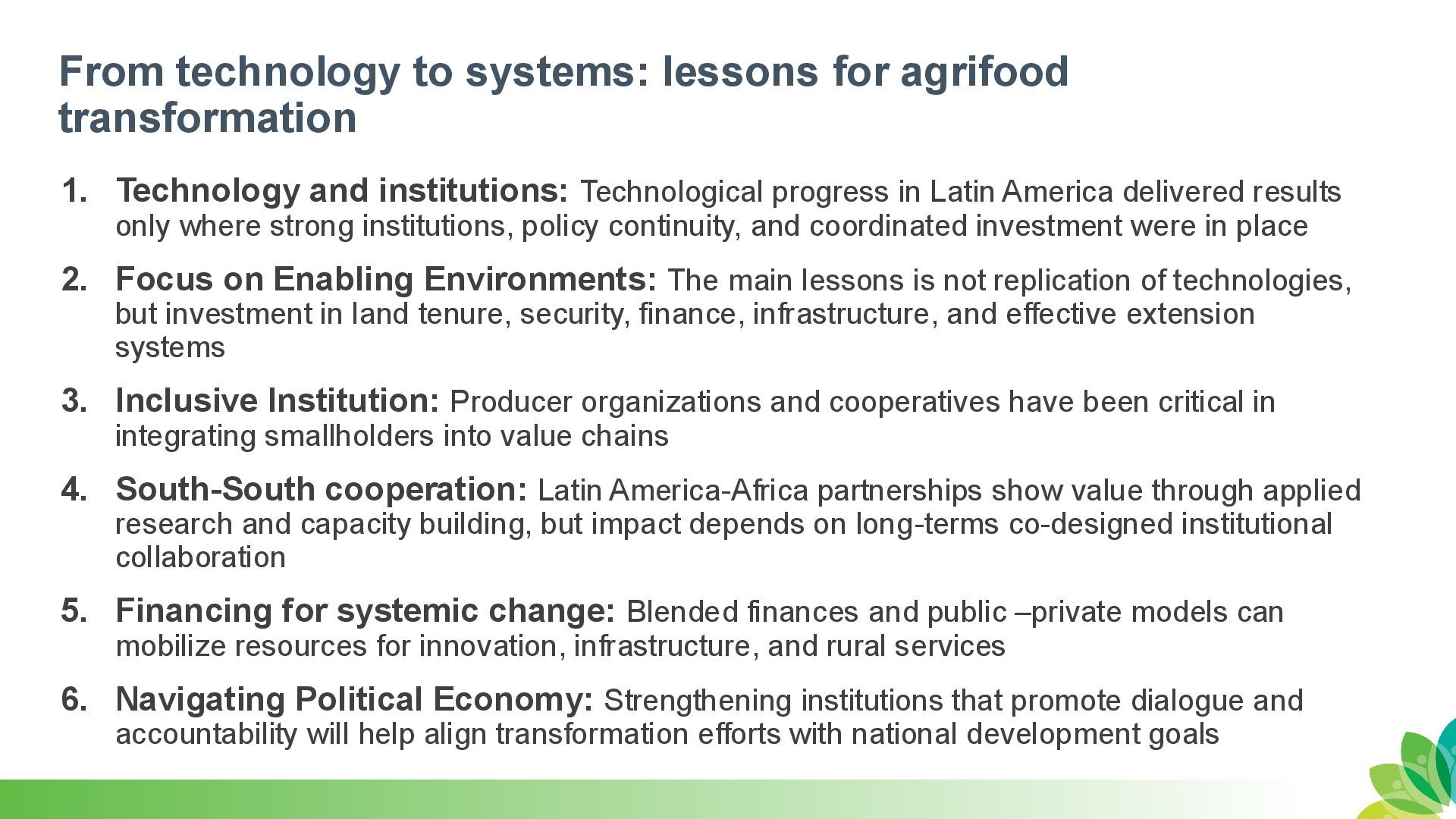 and institutions: Technological progress in Latin America delivered results only where strong institutions, policy continuity, and coordinated investment were in place 2. Focus on Enabling Environments: The main lessons is not replication of technologies, but investment in land tenure, security, finance, infrastructure, and effective extension systems 3. Inclusive Institution: Producer organizations and cooperatives have been critical in integrating smallholders into value chains 4. South-South cooperation: Latin America-Africa partnerships show value through applied research and capacity building, but impact depends on long-terms co-designed institutional collaboration 5. Financing for systemic change: Blended finances and public –private models can mobilize resources for innovation, infrastructure, and rural services 6. Navigating Political Economy: Strengthening institutions that promote dialogue and accountability will help align transformation efforts with national development goals