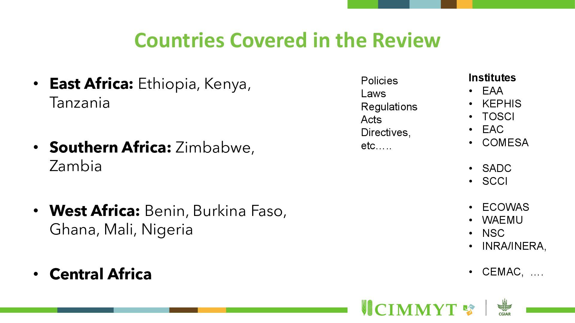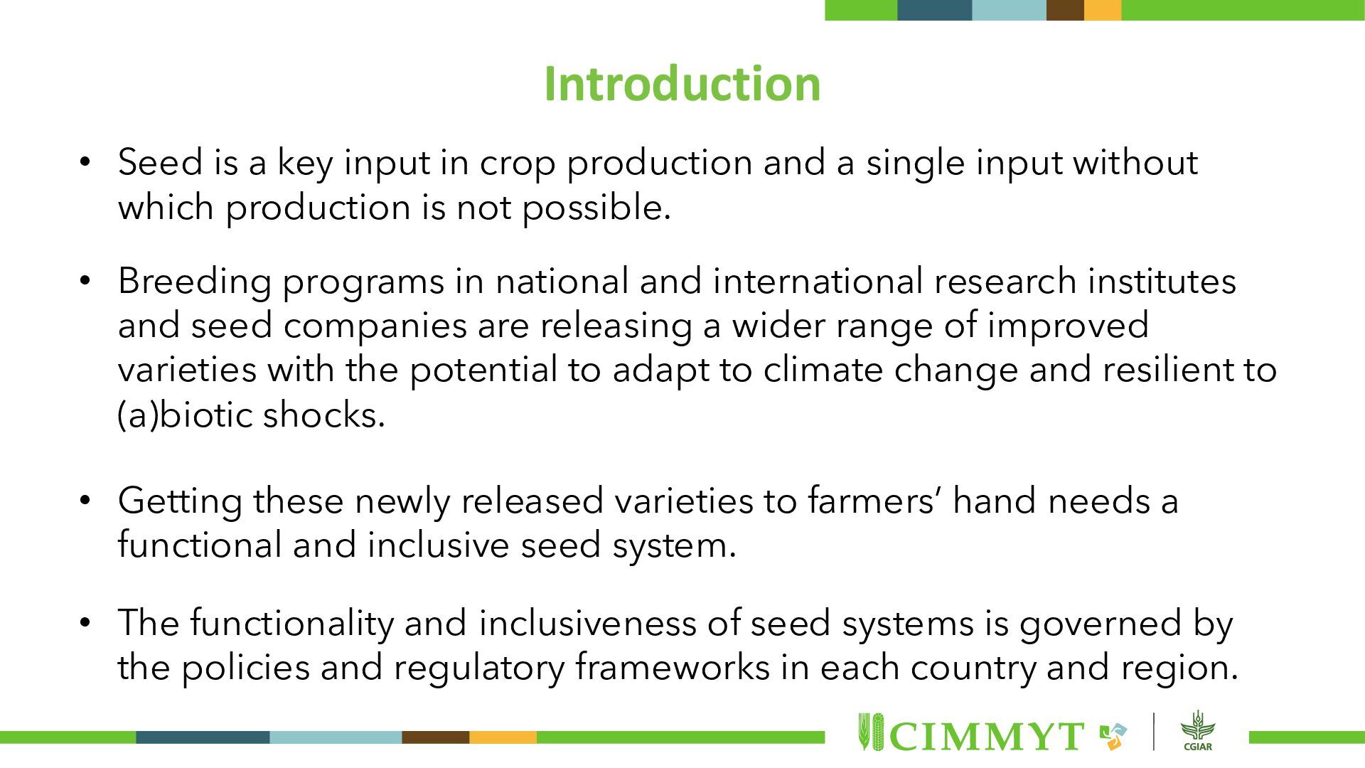and a single input without which production is not possible. • Breeding programs in national and international research institutes and seed companies are releasing a wider range of improved varieties with the potential to adapt to climate change and resilient to (a)biotic shocks. • Getting these newly released varieties to farmers’ hand needs a functional and inclusive seed system. • The functionality and inclusiveness of seed systems is governed by the policies and regulatory frameworks in each country and region.