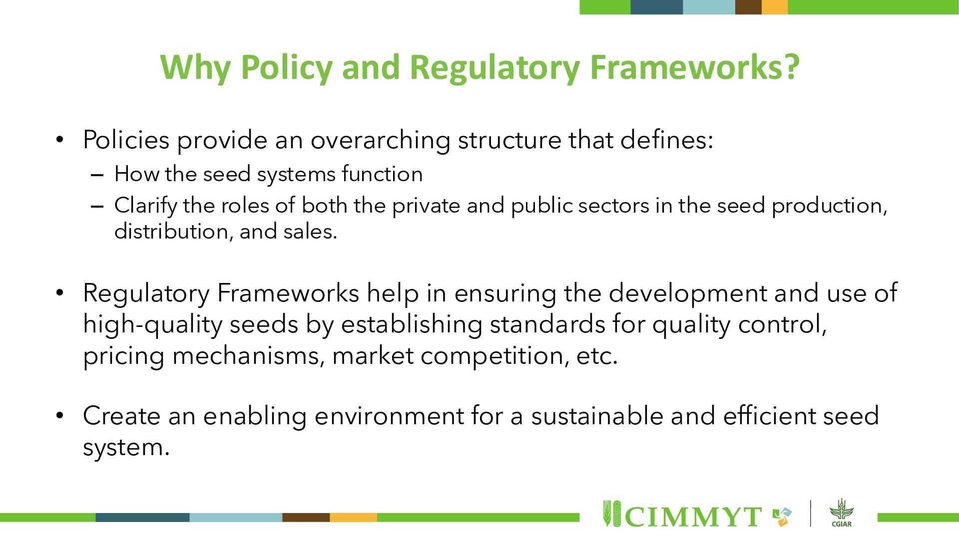 structure that defines: – How the seed systems function – Clarify the roles of both the private and public sectors in the seed production, distribution, and sales. • Regulatory Frameworks help in ensuring the development and use of high-quality seeds by establishing standards for quality control, pricing mechanisms, market competition, etc. • Create an enabling environment for a sustainable and efficient seed system.