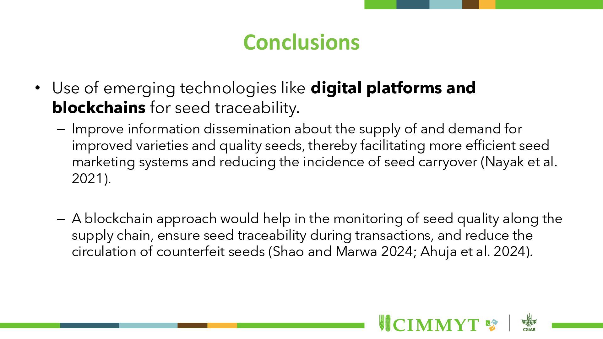 blockchains for seed traceability. – Improve information dissemination about the supply of and demand for improved varieties and quality seeds, thereby facilitating more efficient seed marketing systems and reducing the incidence of seed carryover (Nayak et al. 2021). – A blockchain approach would help in the monitoring of seed quality along the supply chain, ensure seed traceability during transactions, and reduce the circulation of counterfeit seeds (Shao and Marwa 2024; Ahuja et al. 2024).