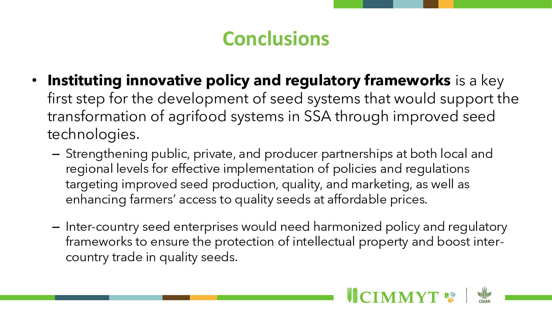 key first step for the development of seed systems that would support the transformation of agrifood systems in SSA through improved seed technologies. – Strengthening public, private, and producer partnerships at both local and regional levels for effective implementation of policies and regulations targeting improved seed production, quality, and marketing, as well as enhancing farmers’ access to quality seeds at affordable prices. – Inter-country seed enterprises would need harmonized policy and regulatory frameworks to ensure the protection of intellectual property and boost inter- country trade in quality seeds.