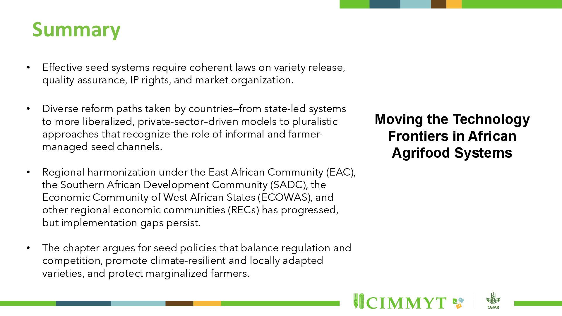 release, quality assurance, IP rights, and market organization. • Diverse reform paths taken by countries—from state-led systems to more liberalized, private-sector–driven models to pluralistic approaches that recognize the role of informal and farmer- managed seed channels. • Regional harmonization under the East African Community (EAC), the Southern African Development Community (SADC), the Economic Community of West African States (ECOWAS), and other regional economic communities (RECs) has progressed, but implementation gaps persist. • The chapter argues for seed policies that balance regulation and competition, promote climate-resilient and locally adapted varieties, and protect marginalized farmers. Moving the Technology Frontiers in African Agrifood Systems