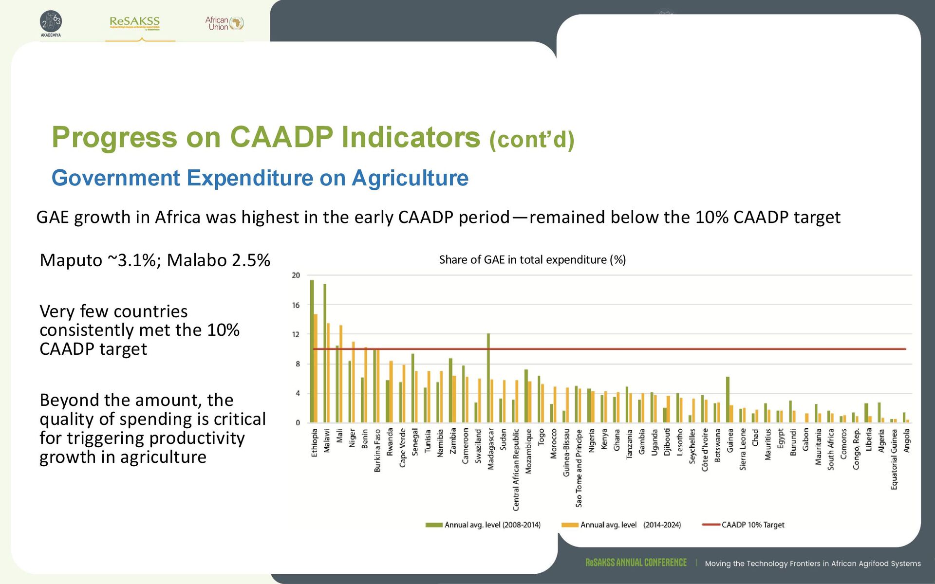 highest in the early CAADP period—remained below the 10% CAADP target Government Expenditure on Agriculture Maputo ~3.1%; Malabo 2.5% Very few countries consistently met the 10% CAADP target Beyond the amount, the quality of spending is critical for triggering productivity growth in agriculture Share of GAE in total expenditure (%)