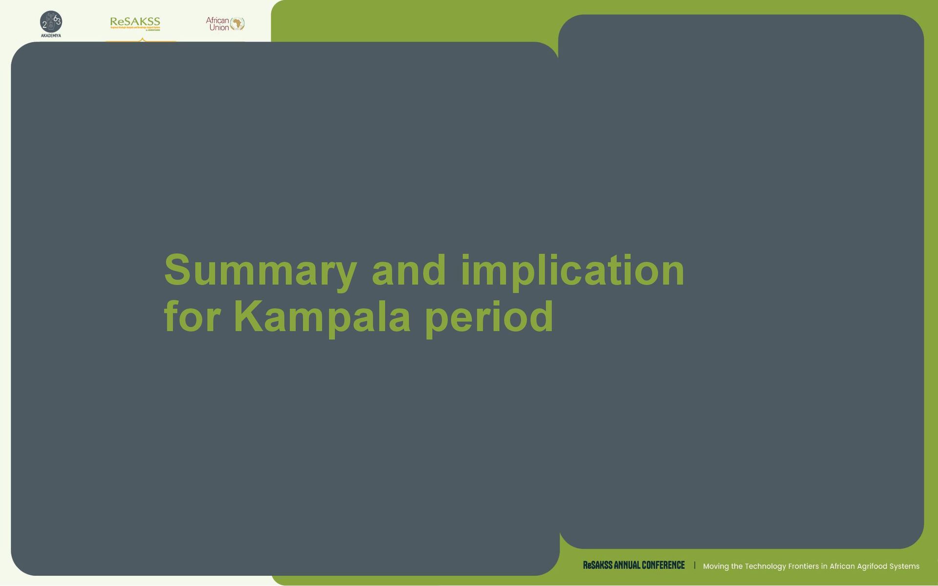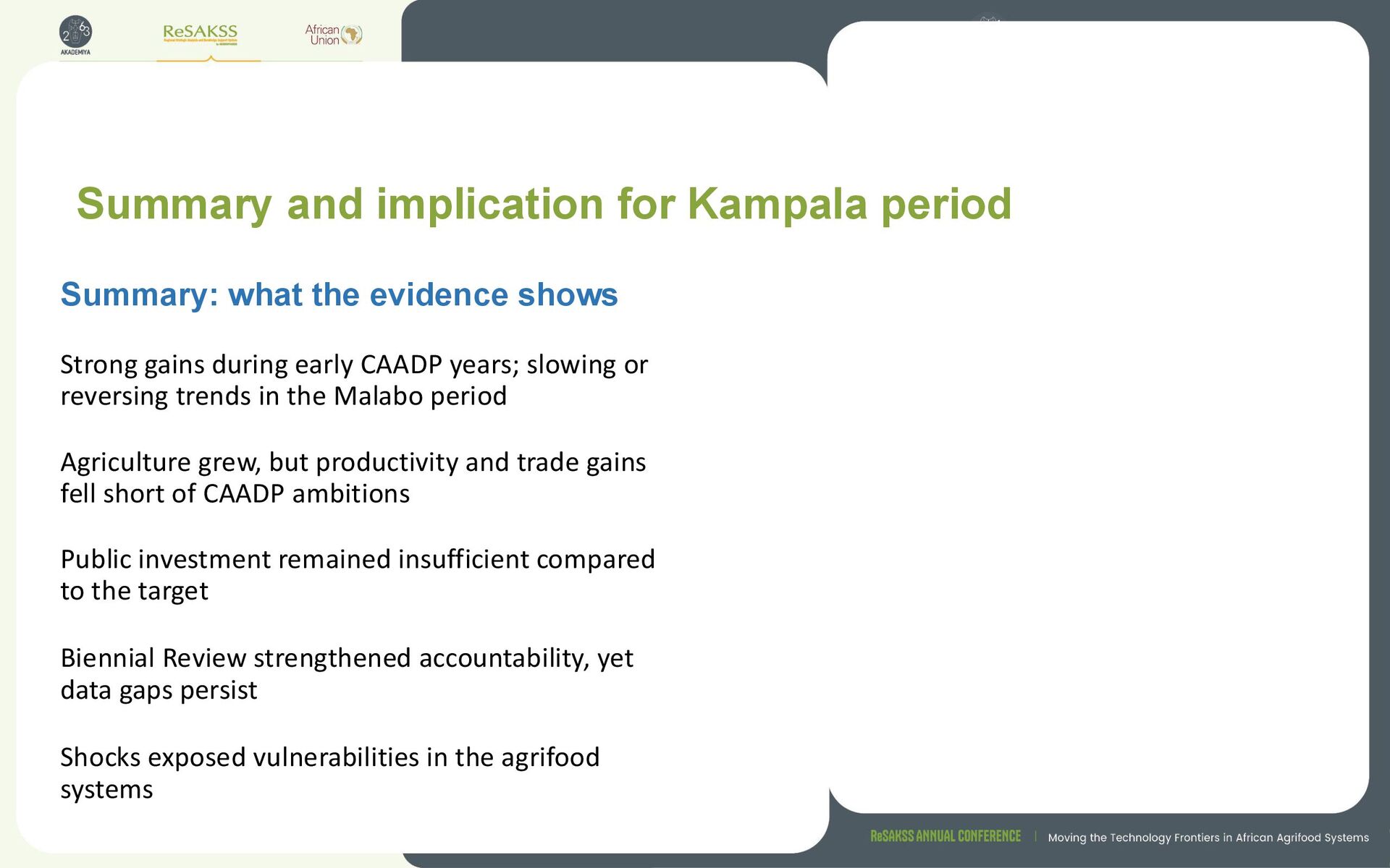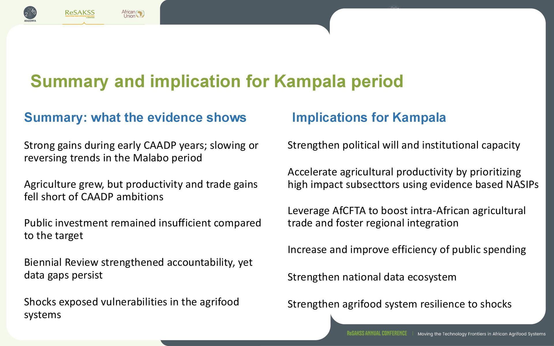 CAADP years; slowing or reversing trends in the Malabo period Agriculture grew, but productivity and trade gains fell short of CAADP ambitions Public investment remained insufficient compared to the target Biennial Review strengthened accountability, yet data gaps persist Shocks exposed vulnerabilities in the agrifood systems Summary: what the evidence shows Implications for Kampala Strengthen political will and institutional capacity Accelerate agricultural productivity by prioritizing high impact subsecttors using evidence based NASIPs Leverage AfCFTA to boost intra-African agricultural trade and foster regional integration Increase and improve efficiency of public spending Strengthen national data ecosystem Strengthen agrifood system resilience to shocks