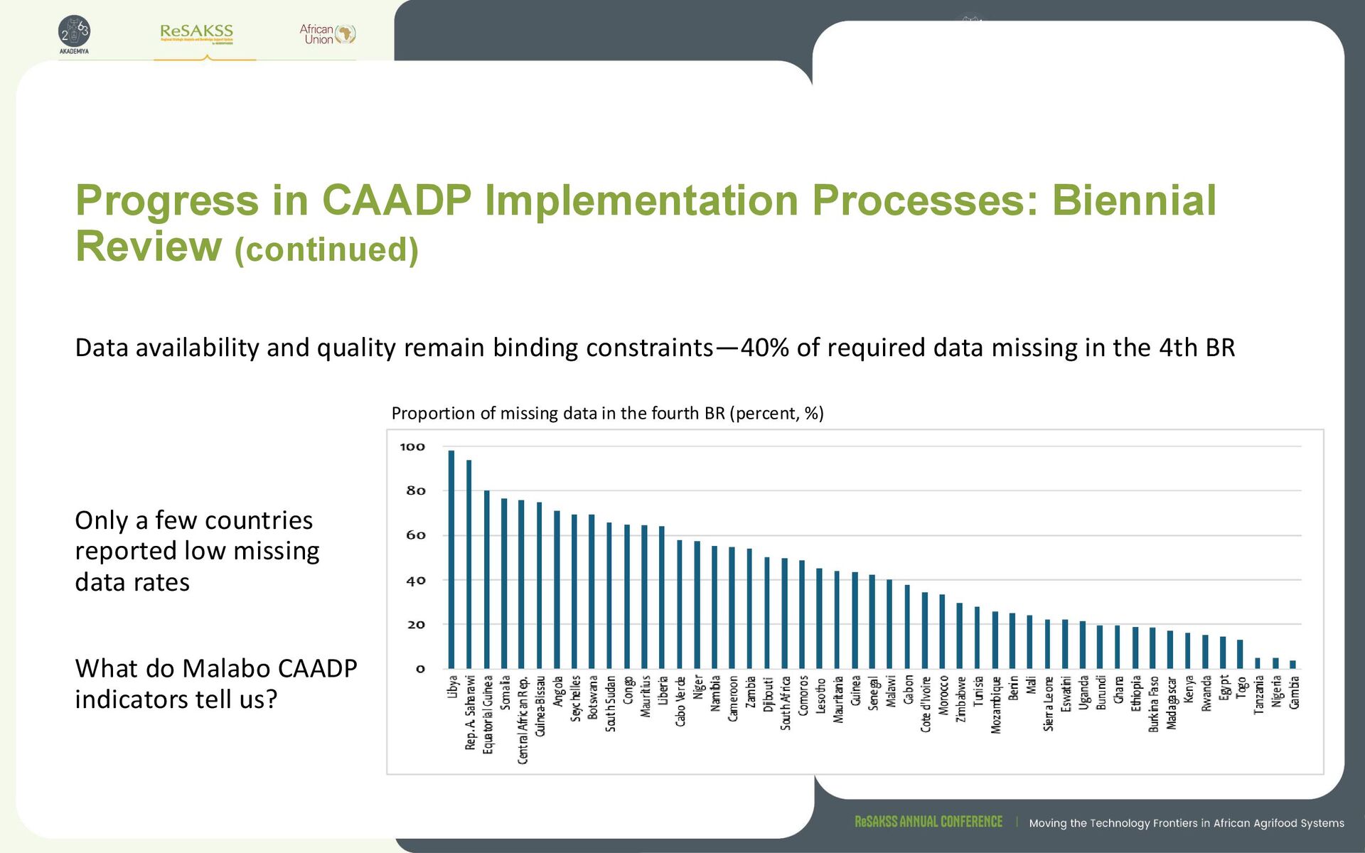 and quality remain binding constraints—40% of required data missing in the 4th BR Proportion of missing data in the fourth BR (percent, %) Only a few countries reported low missing data rates What do Malabo CAADP indicators tell us?