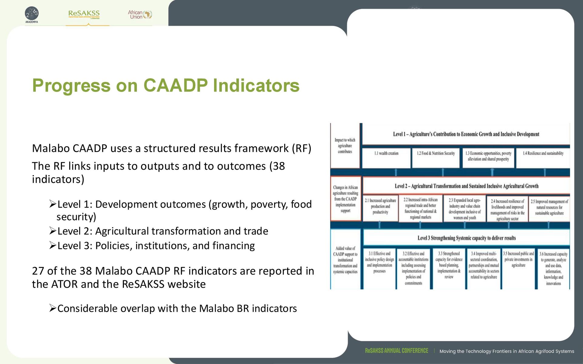 framework (RF) The RF links inputs to outputs and to outcomes (38 indicators) ➢Level 1: Development outcomes (growth, poverty, food security) ➢Level 2: Agricultural transformation and trade ➢Level 3: Policies, institutions, and financing 27 of the 38 Malabo CAADP RF indicators are reported in the ATOR and the ReSAKSS website ➢Considerable overlap with the Malabo BR indicators