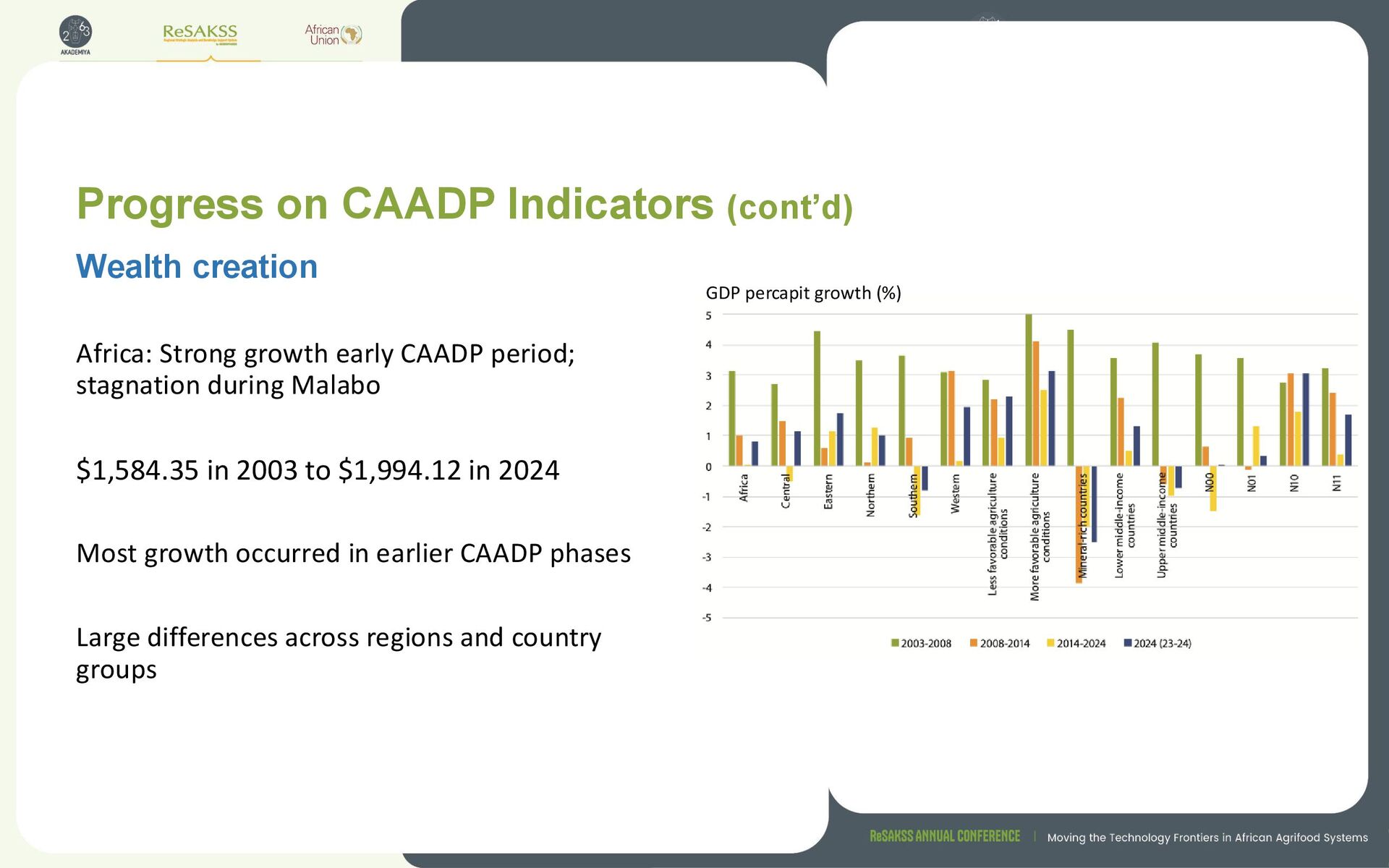 period; stagnation during Malabo $1,584.35 in 2003 to $1,994.12 in 2024 Most growth occurred in earlier CAADP phases Large differences across regions and country groups Wealth creation GDP percapit growth (%)
