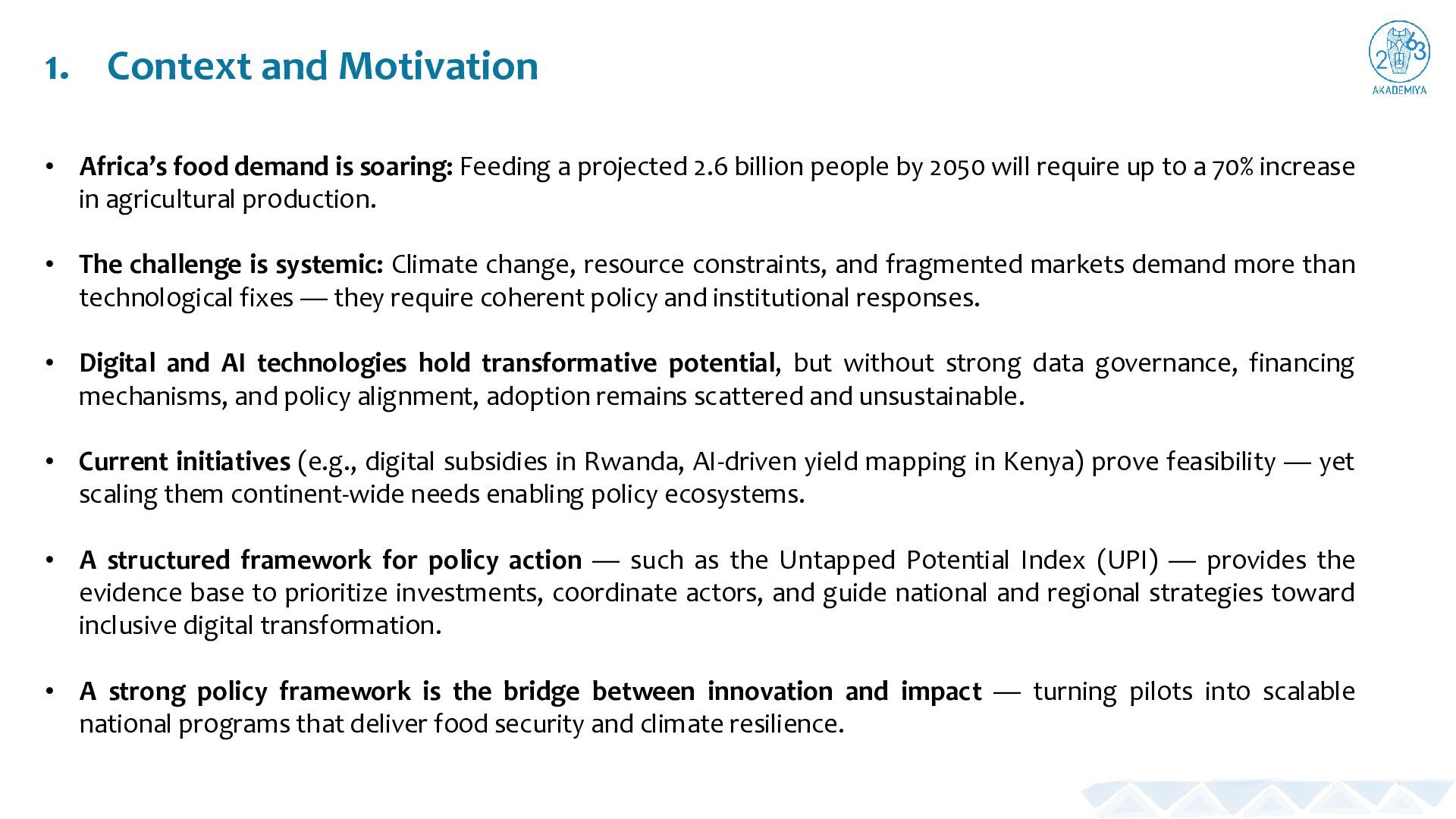 Feeding a projected 2.6 billion people by 2050 will require up to a 70% increase in agricultural production. • The challenge is systemic: Climate change, resource constraints, and fragmented markets demand more than technological fixes — they require coherent policy and institutional responses. • Digital and AI technologies hold transformative potential, but without strong data governance, financing mechanisms, and policy alignment, adoption remains scattered and unsustainable. • Current initiatives (e.g., digital subsidies in Rwanda, AI-driven yield mapping in Kenya) prove feasibility — yet scaling them continent-wide needs enabling policy ecosystems. • A structured framework for policy action — such as the Untapped Potential Index (UPI) — provides the evidence base to prioritize investments, coordinate actors, and guide national and regional strategies toward inclusive digital transformation. • A strong policy framework is the bridge between innovation and impact — turning pilots into scalable national programs that deliver food security and climate resilience.