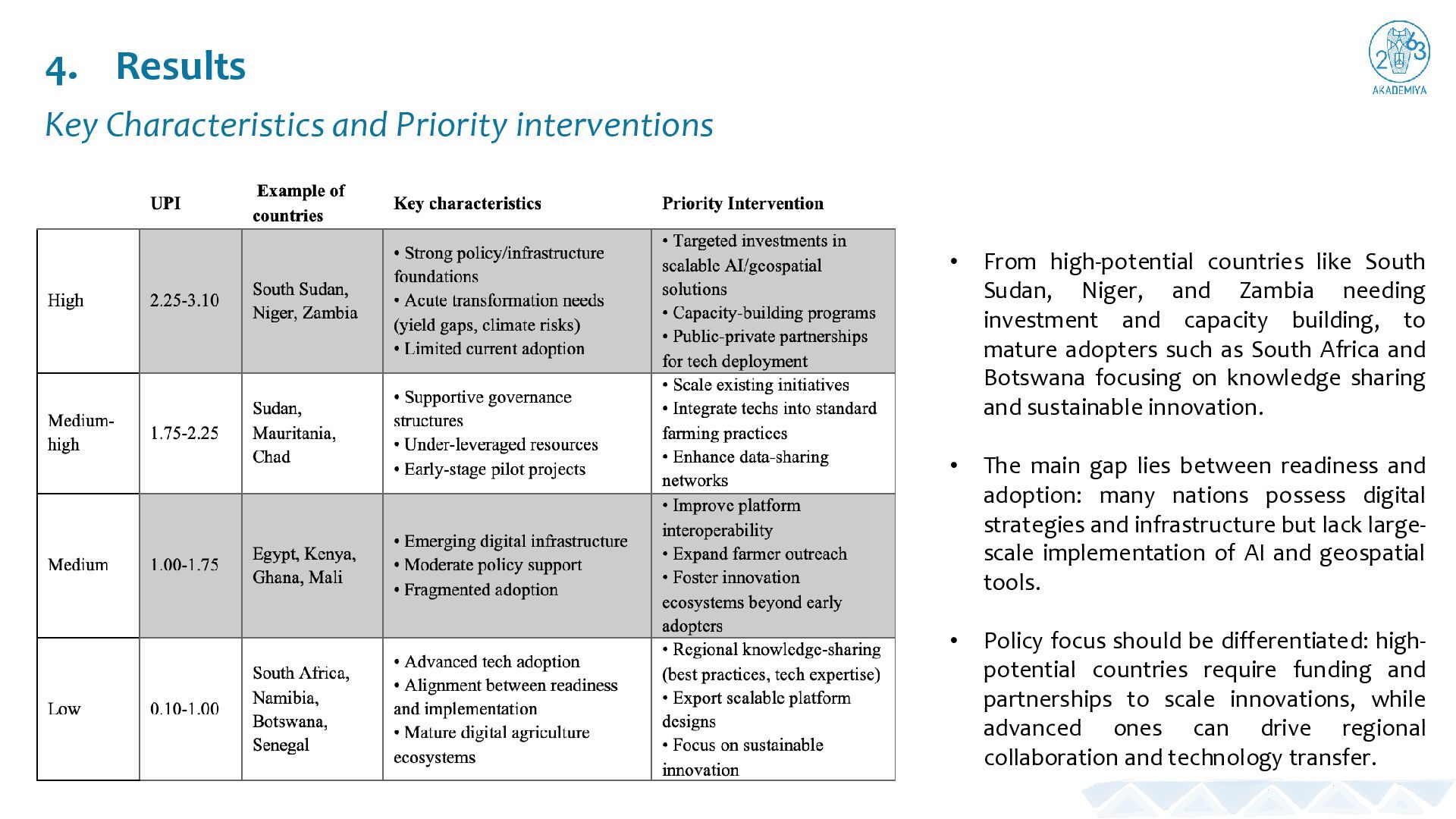 countries like South Sudan, Niger, and Zambia needing investment and capacity building, to mature adopters such as South Africa and Botswana focusing on knowledge sharing and sustainable innovation. • The main gap lies between readiness and adoption: many nations possess digital strategies and infrastructure but lack large- scale implementation of AI and geospatial tools. • Policy focus should be differentiated: high- potential countries require funding and partnerships to scale innovations, while advanced ones can drive regional collaboration and technology transfer.