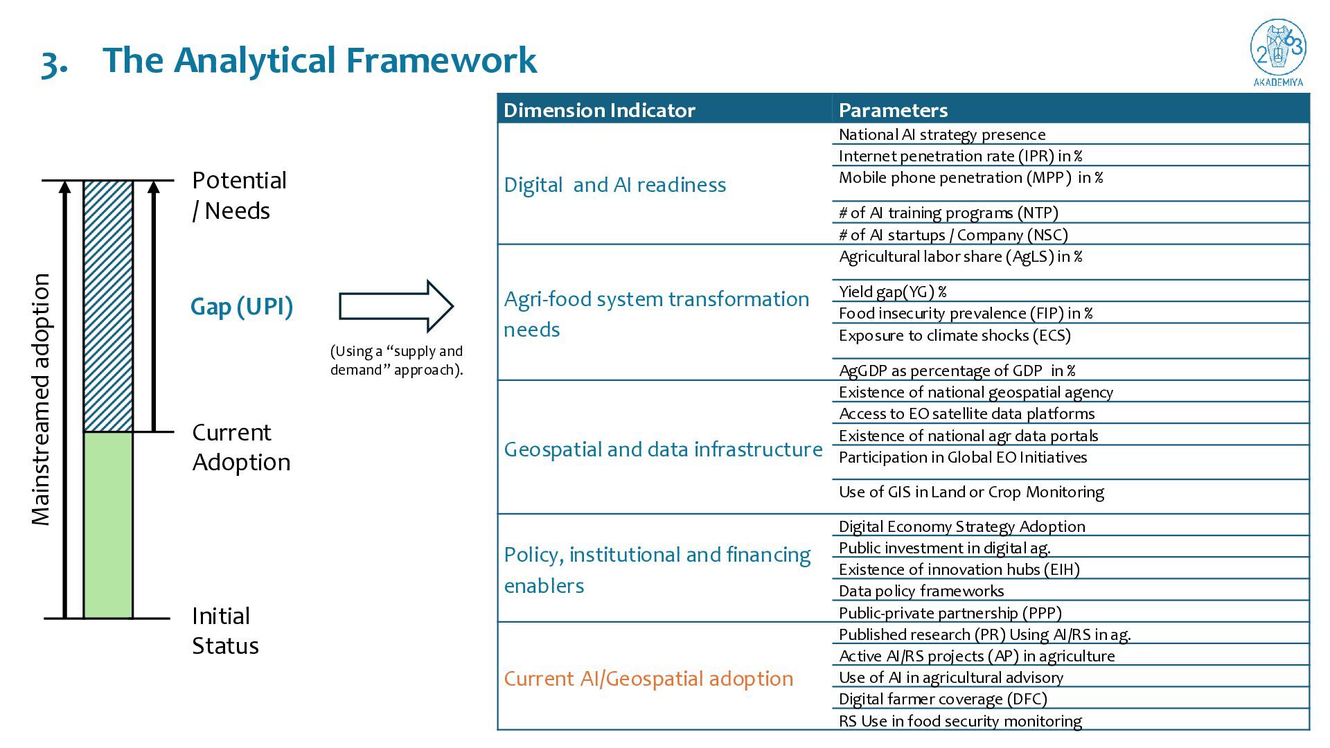 Status Mainstreamed adoption Gap (UPI) (Using a “supply and demand” approach). Dimension Indicator Parameters Digital and AI readiness National AI strategy presence Internet penetration rate (IPR) in % Mobile phone penetration (MPP) in % # of AI training programs (NTP) # of AI startups / Company (NSC) Agri-food system transformation needs Agricultural labor share (AgLS) in % Yield gap(YG) % Food insecurity prevalence (FIP) in % Exposure to climate shocks (ECS) AgGDP as percentage of GDP in % Geospatial and data infrastructure Existence of national geospatial agency Access to EO satellite data platforms Existence of national agr data portals Participation in Global EO Initiatives Use of GIS in Land or Crop Monitoring Policy, institutional and financing enablers Digital Economy Strategy Adoption Public investment in digital ag. Existence of innovation hubs (EIH) Data policy frameworks Public-private partnership (PPP) Current AI/Geospatial adoption Published research (PR) Using AI/RS in ag. Active AI/RS projects (AP) in agriculture Use of AI in agricultural advisory Digital farmer coverage (DFC) RS Use in food security monitoring