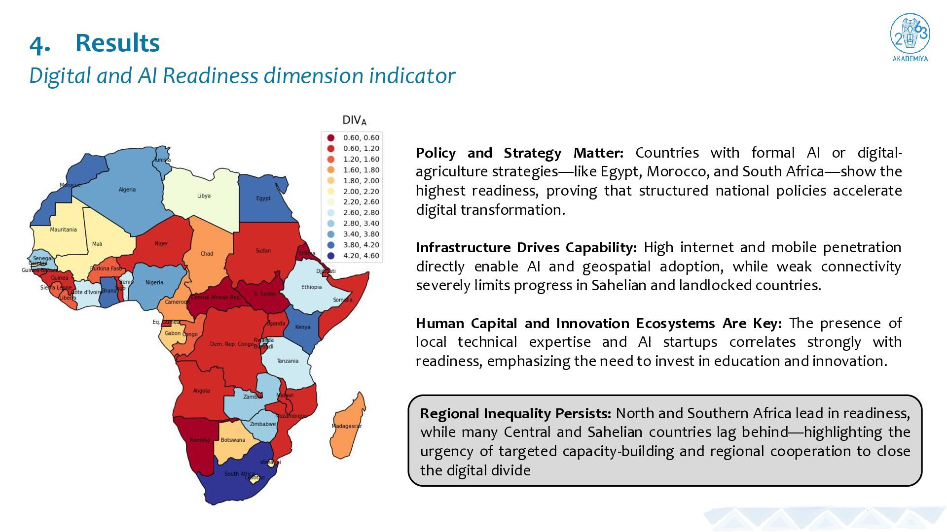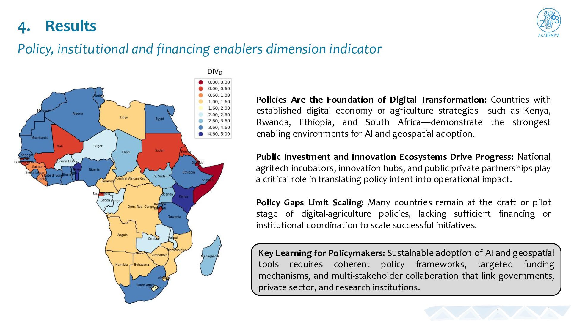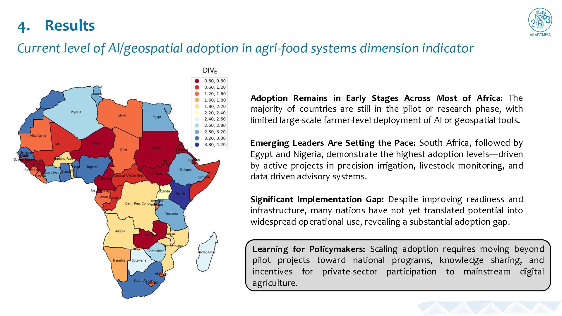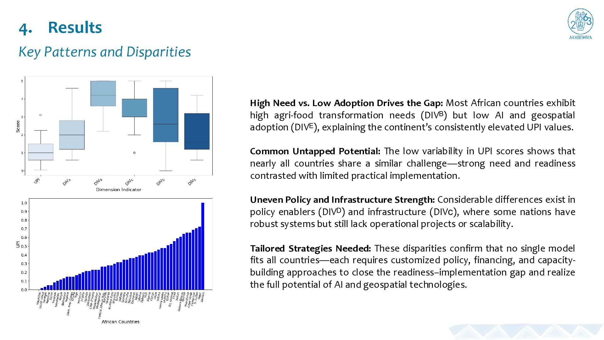 Adoption Drives the Gap: Most African countries exhibit high agri-food transformation needs (DIVᴮ) but low AI and geospatial adoption (DIVᴱ), explaining the continent’s consistently elevated UPI values. Common Untapped Potential: The low variability in UPI scores shows that nearly all countries share a similar challenge—strong need and readiness contrasted with limited practical implementation. Uneven Policy and Infrastructure Strength: Considerable differences exist in policy enablers (DIVᴰ) and infrastructure (DIVᴄ), where some nations have robust systems but still lack operational projects or scalability. Tailored Strategies Needed: These disparities confirm that no single model fits all countries—each requires customized policy, financing, and capacity- building approaches to close the readiness–implementation gap and realize the full potential of AI and geospatial technologies.
